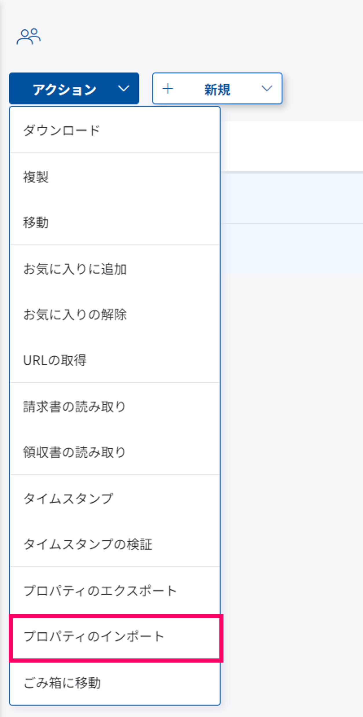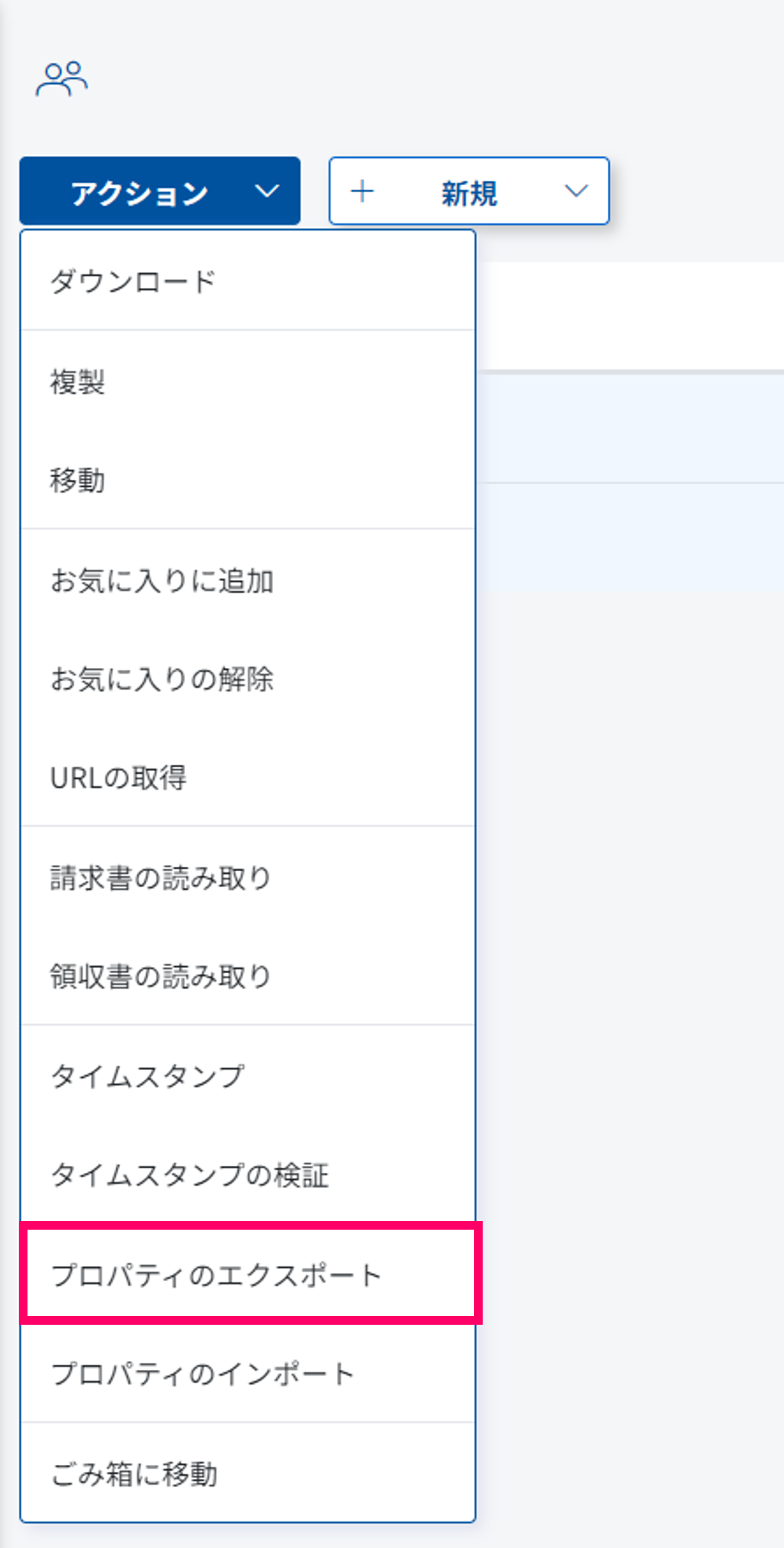 (2) アクションから「プロパティのエクスポート」を選択します。