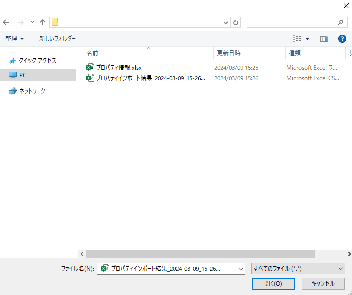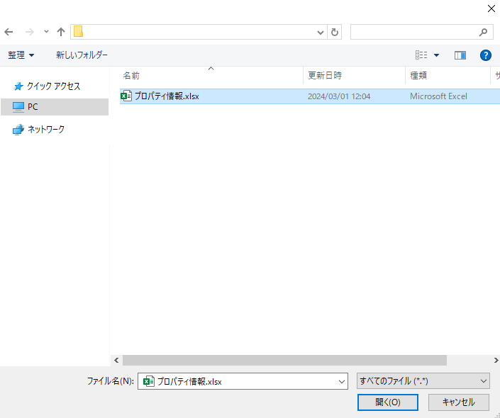 インポートの場合は、更新対象のプロパティセット・プロパティはエクスポート同様に名前をベースに集約して列方向に並べます。