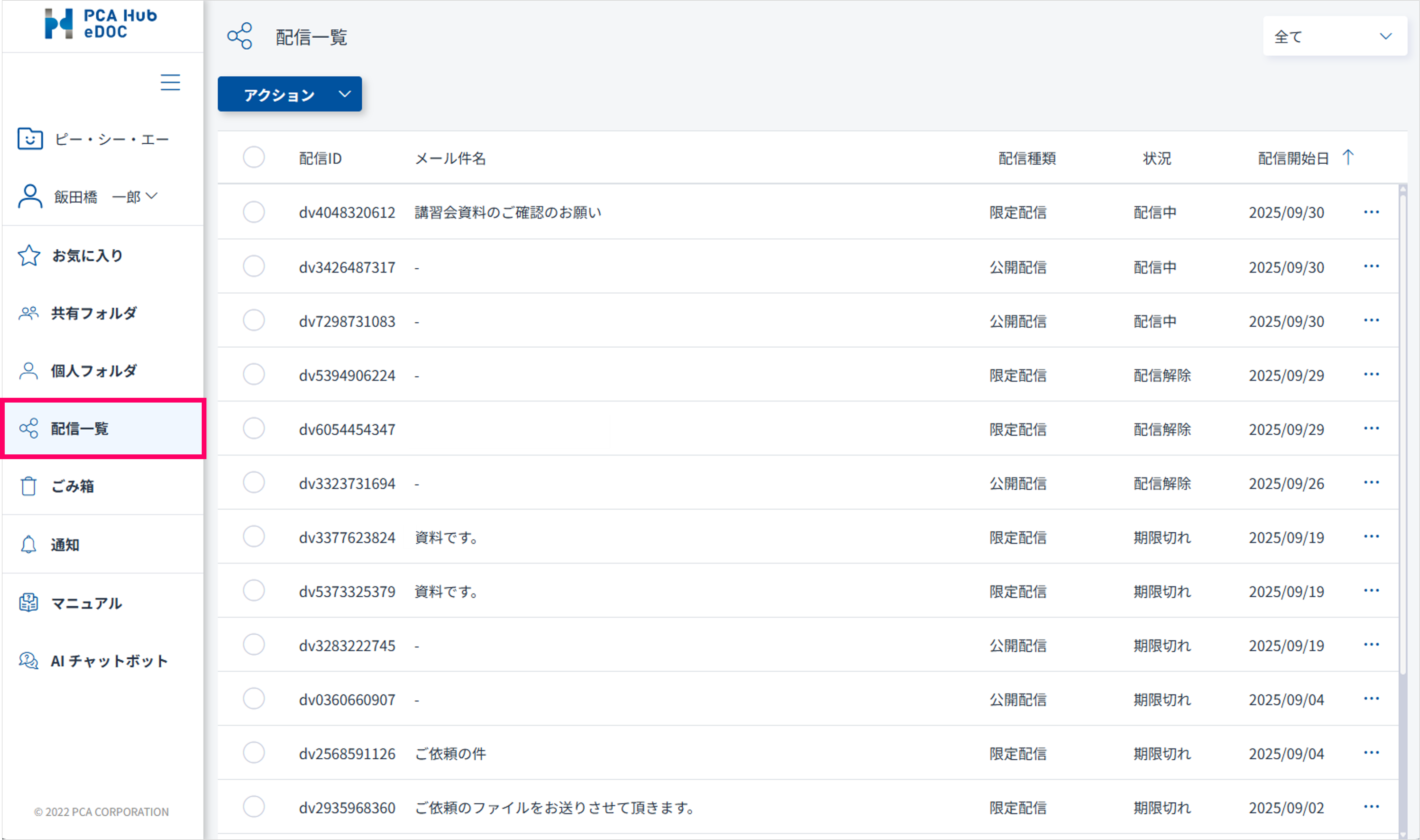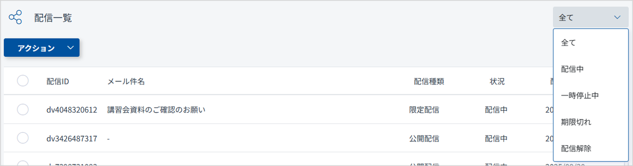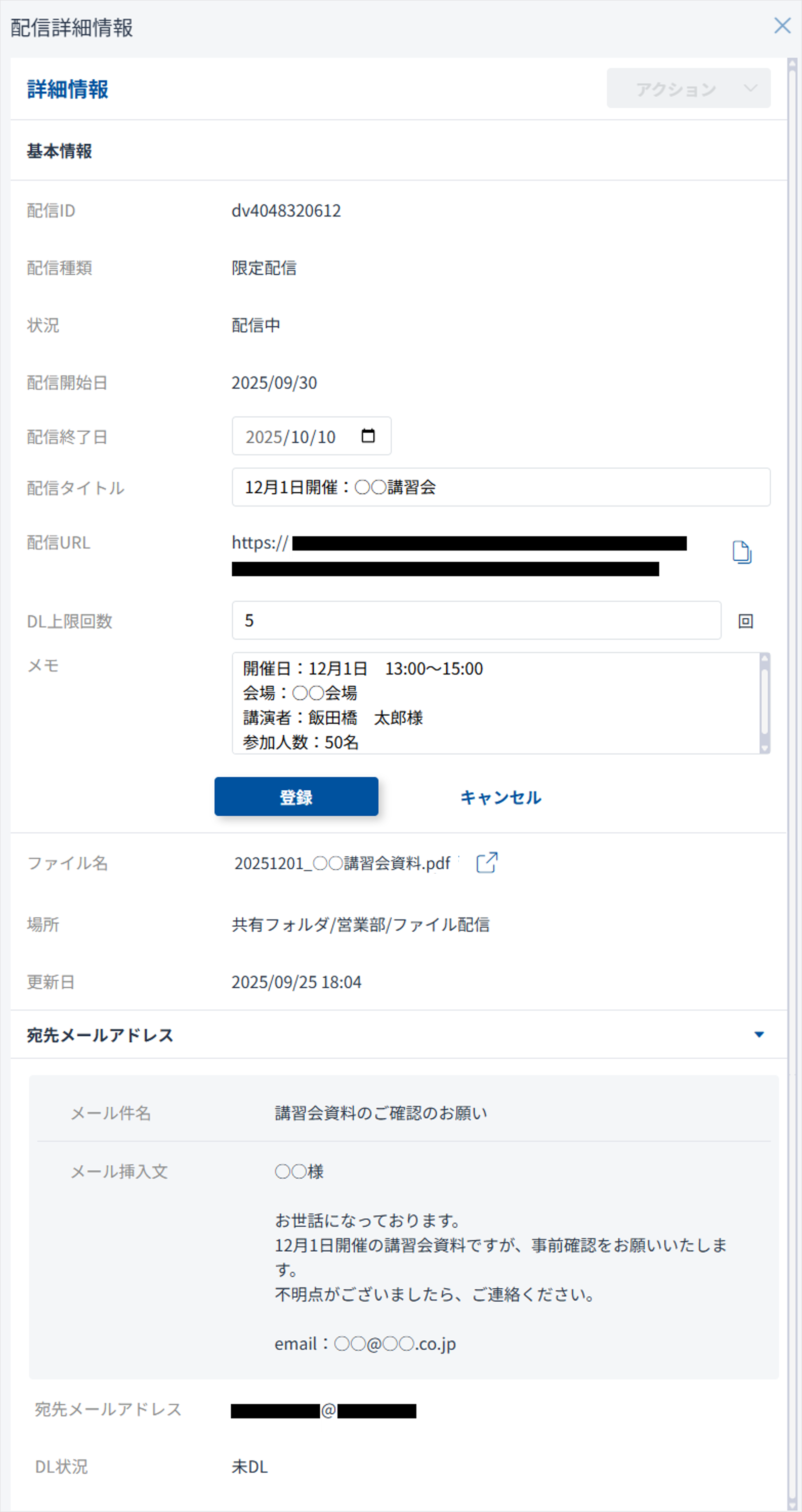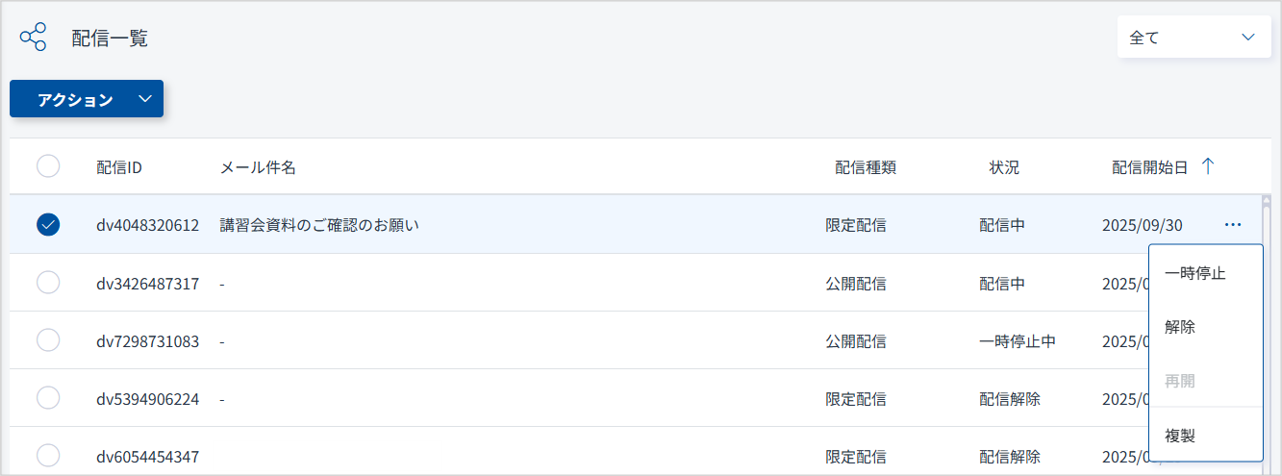 ご自身で配信したファイルについて、配信履歴の確認やステータス(状況)の変更、配信情報の修正、複製などの操作を行います。