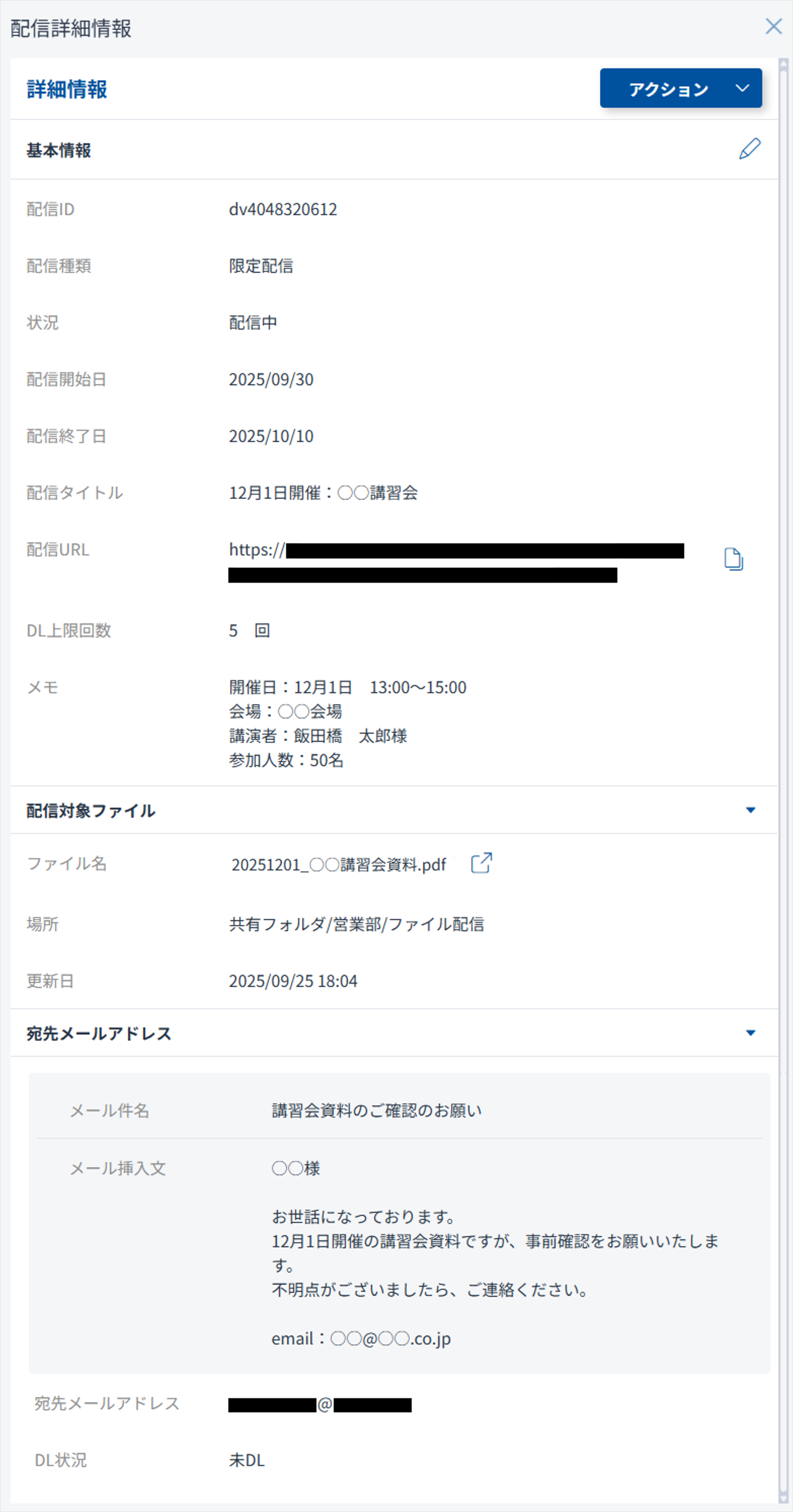 配信したファイルについて、宛先のメールアドレスごとにダウンロードされたかどうかを確認できます。これにより、配信先ごとのダウンロード状況を把握することができます。