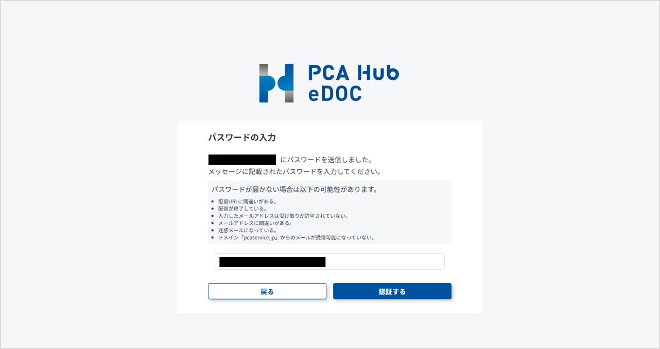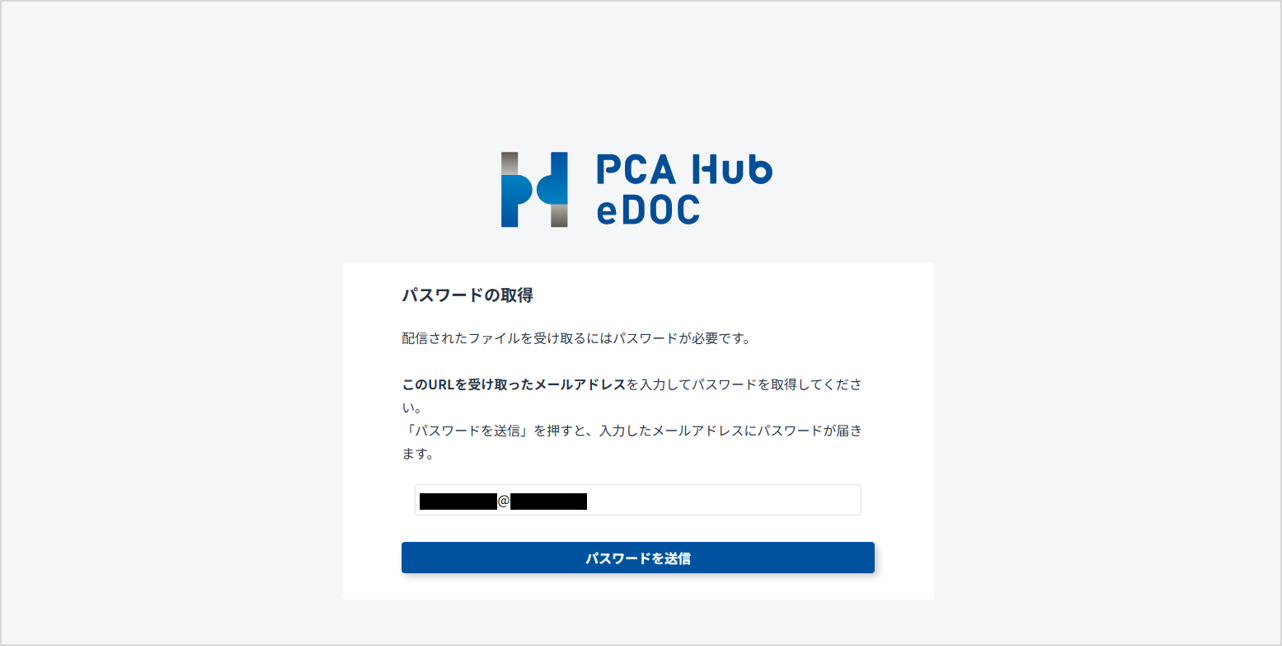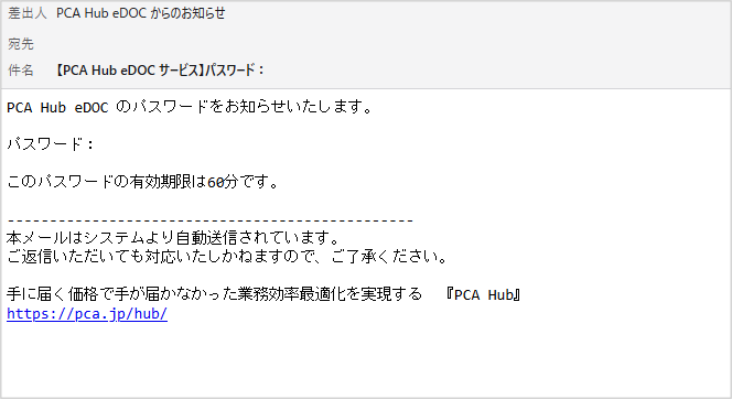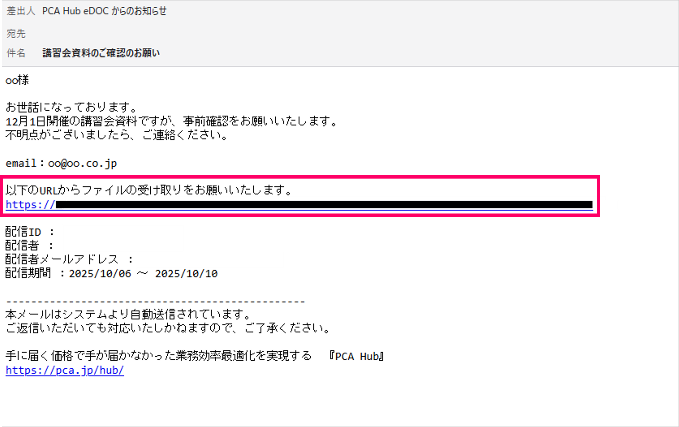 「PCA Hub」以外のメール経由で配信URLを受け取った場合、実際に設定されたメールアドレスと異なる可能性があります。その際は、送信者に配信時に設定したメールアドレスをご確認ください。