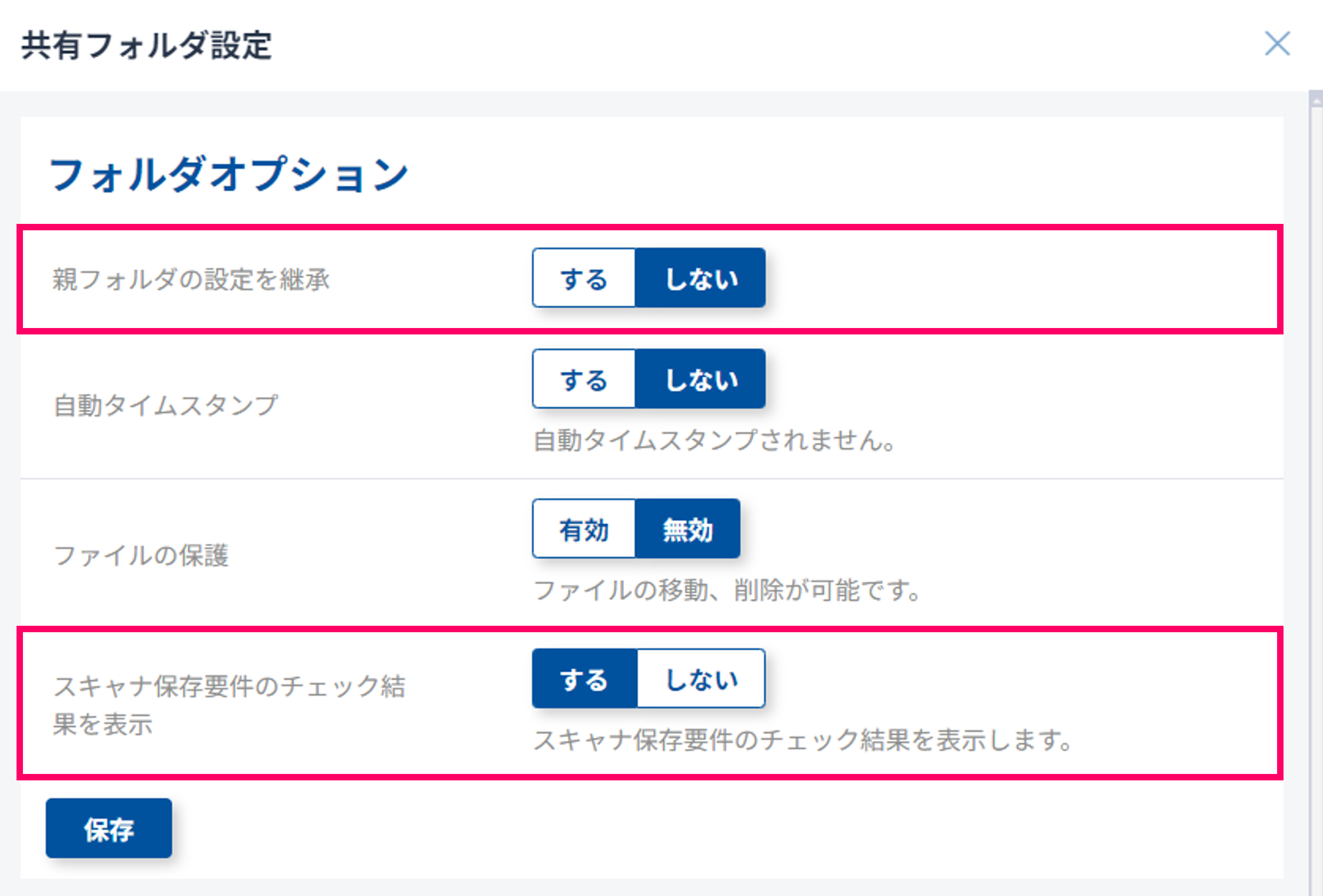 (2) 親フォルダの継承「しない」を選択し、 スキャナ保存要件のチェック結果を表示「する」を選択し「保存」をクリックします。