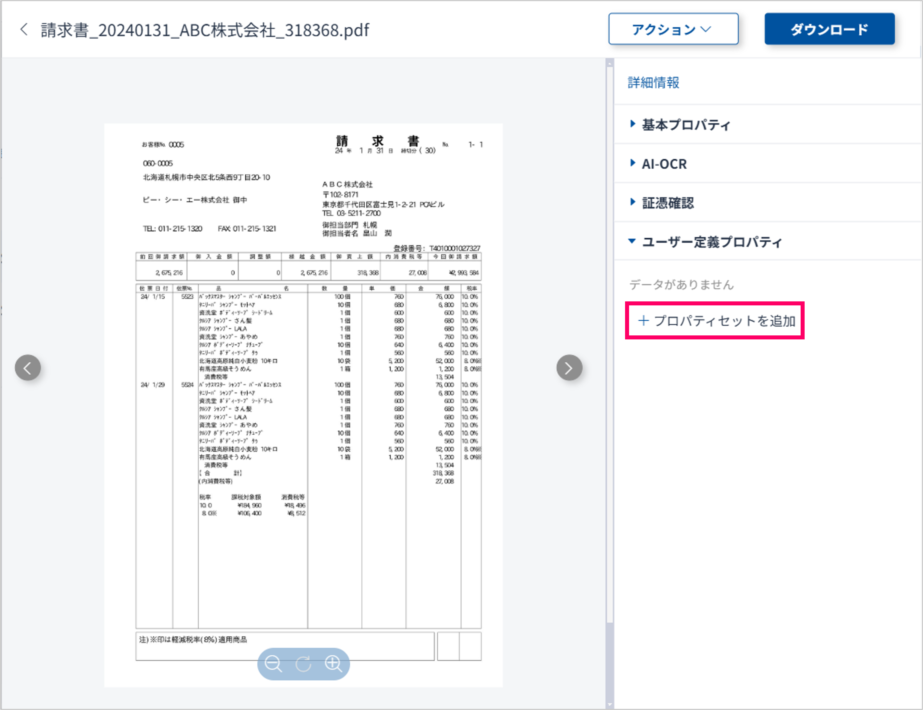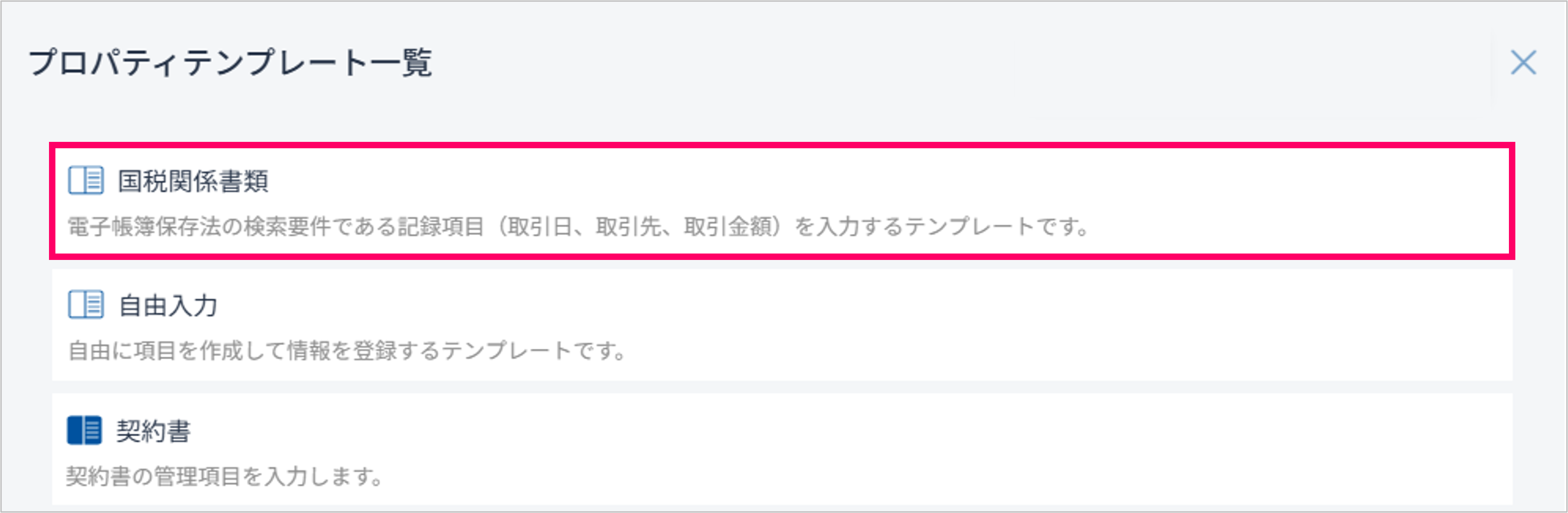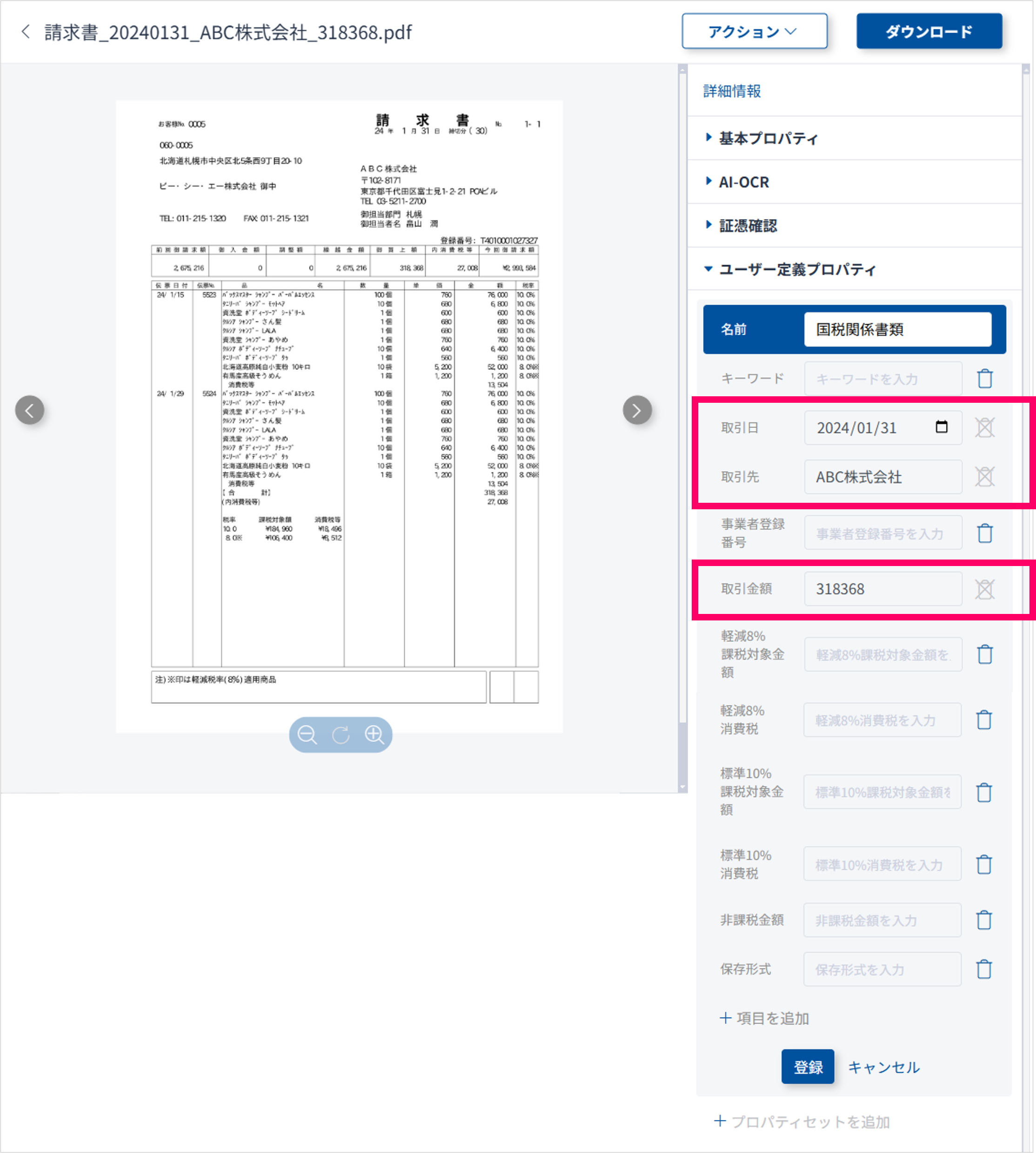 電子帳簿保存法の検索要件である記録項目(取引日、取引先、取引金額)をプロパティ情報に入力します。
