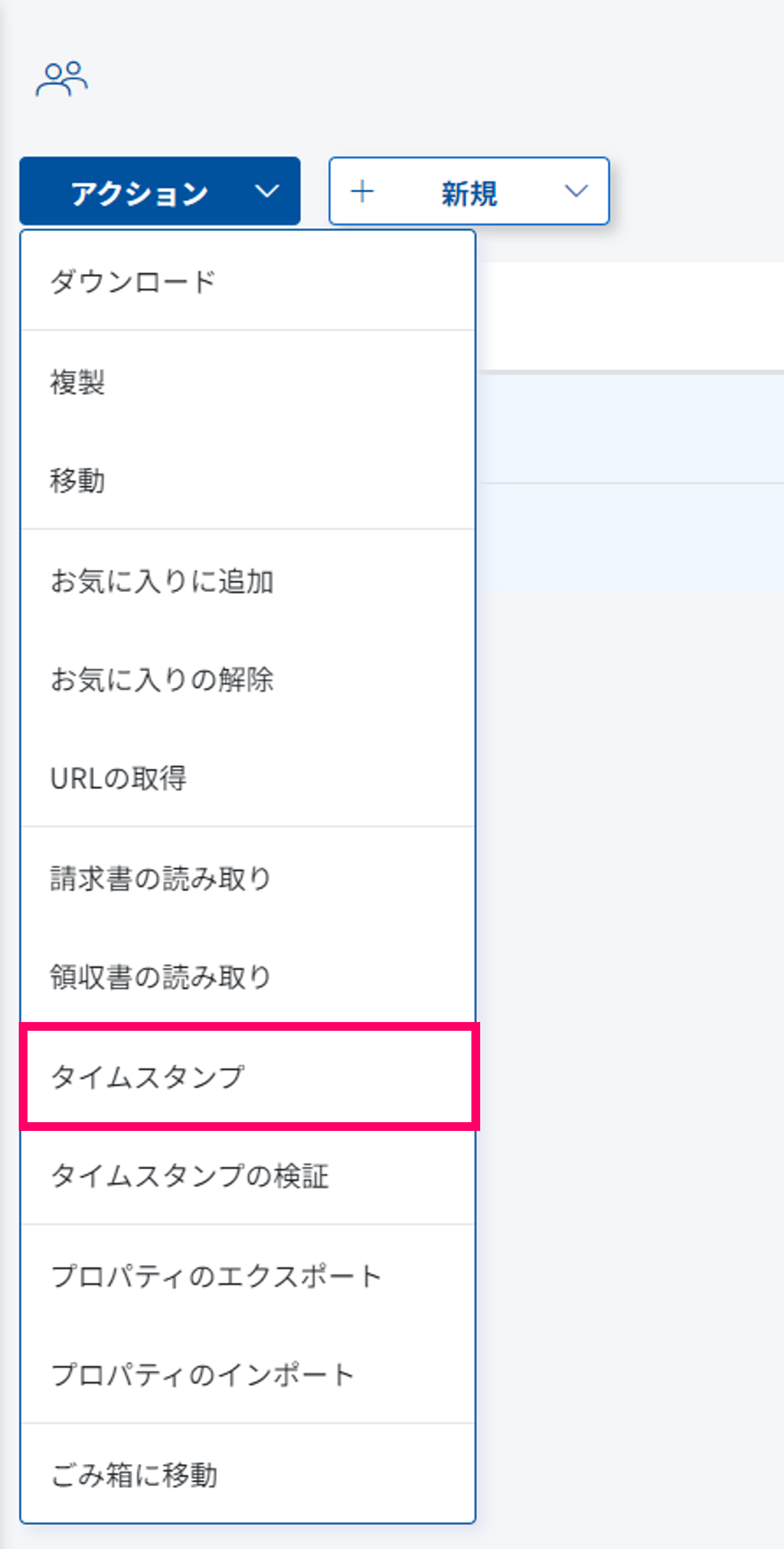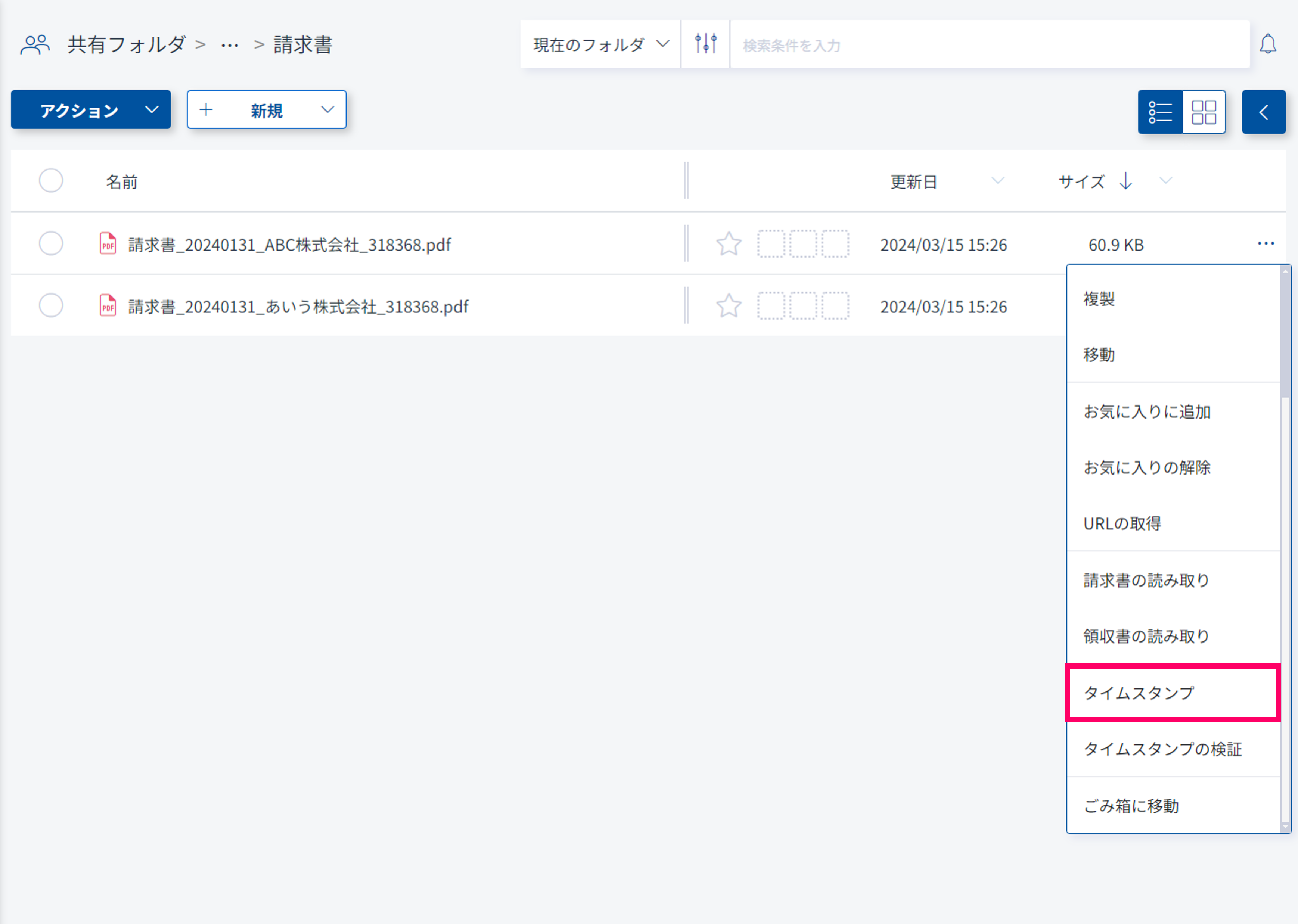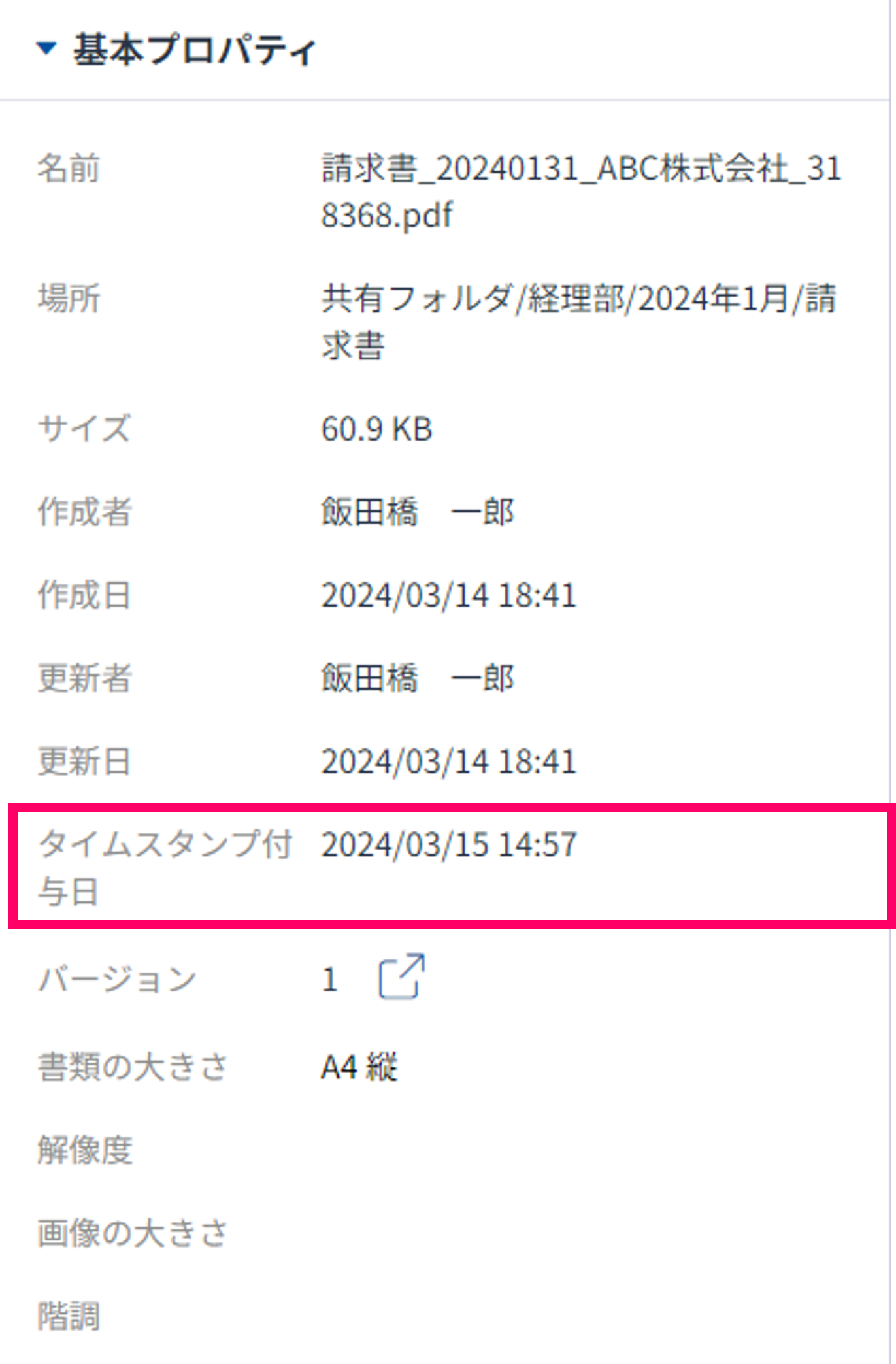 (4) タイムスタンプが付与されたファイル横に を表示します。また、基本プロパティ[タイムスタンプ付与日]が入力されます。