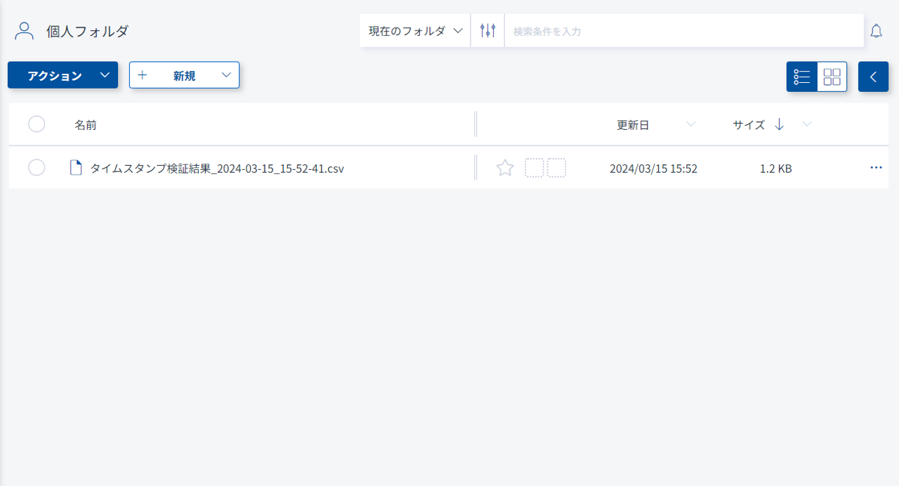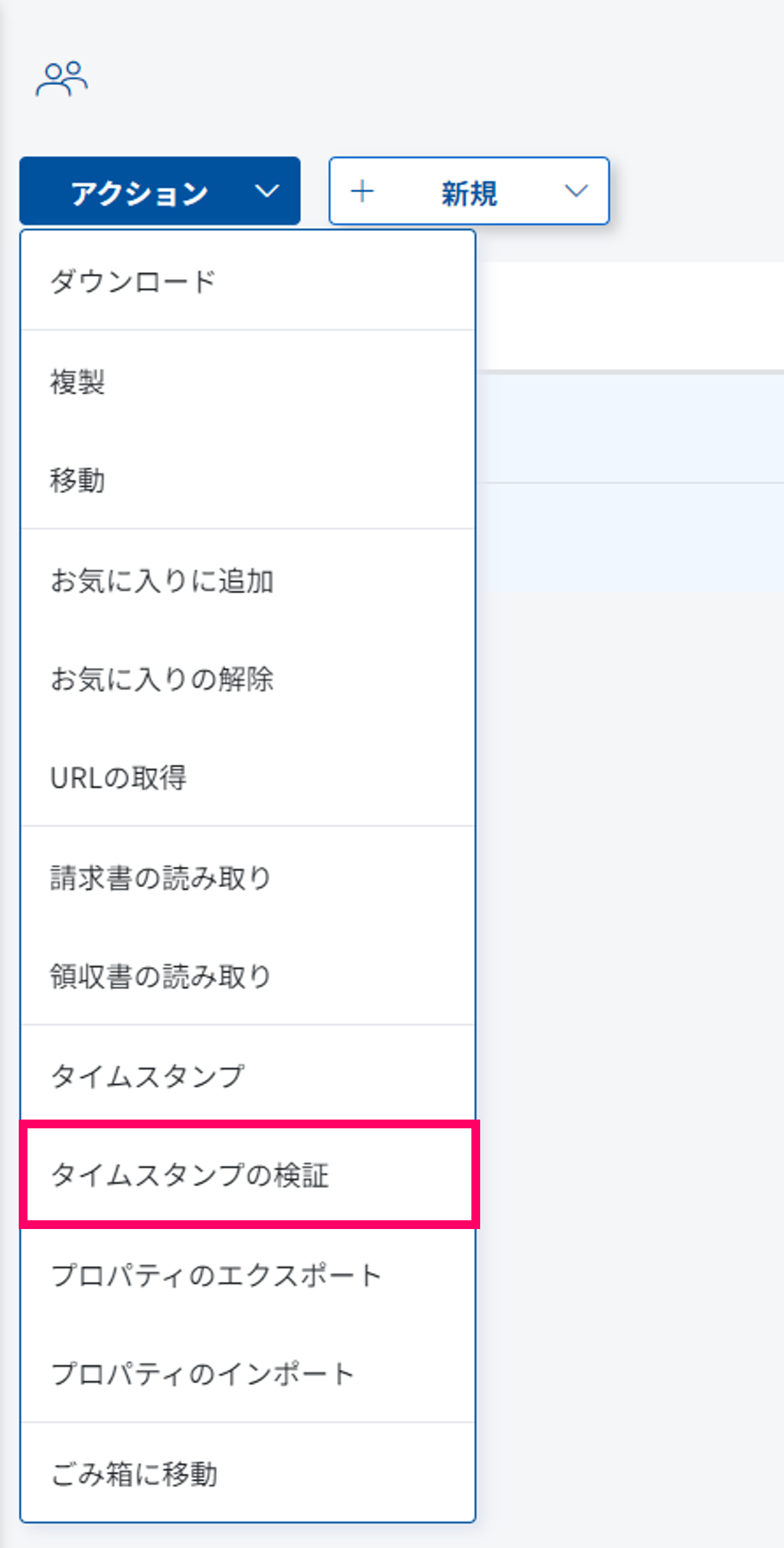 (2) アクションから「タイムスタンプの検証」を選択します。