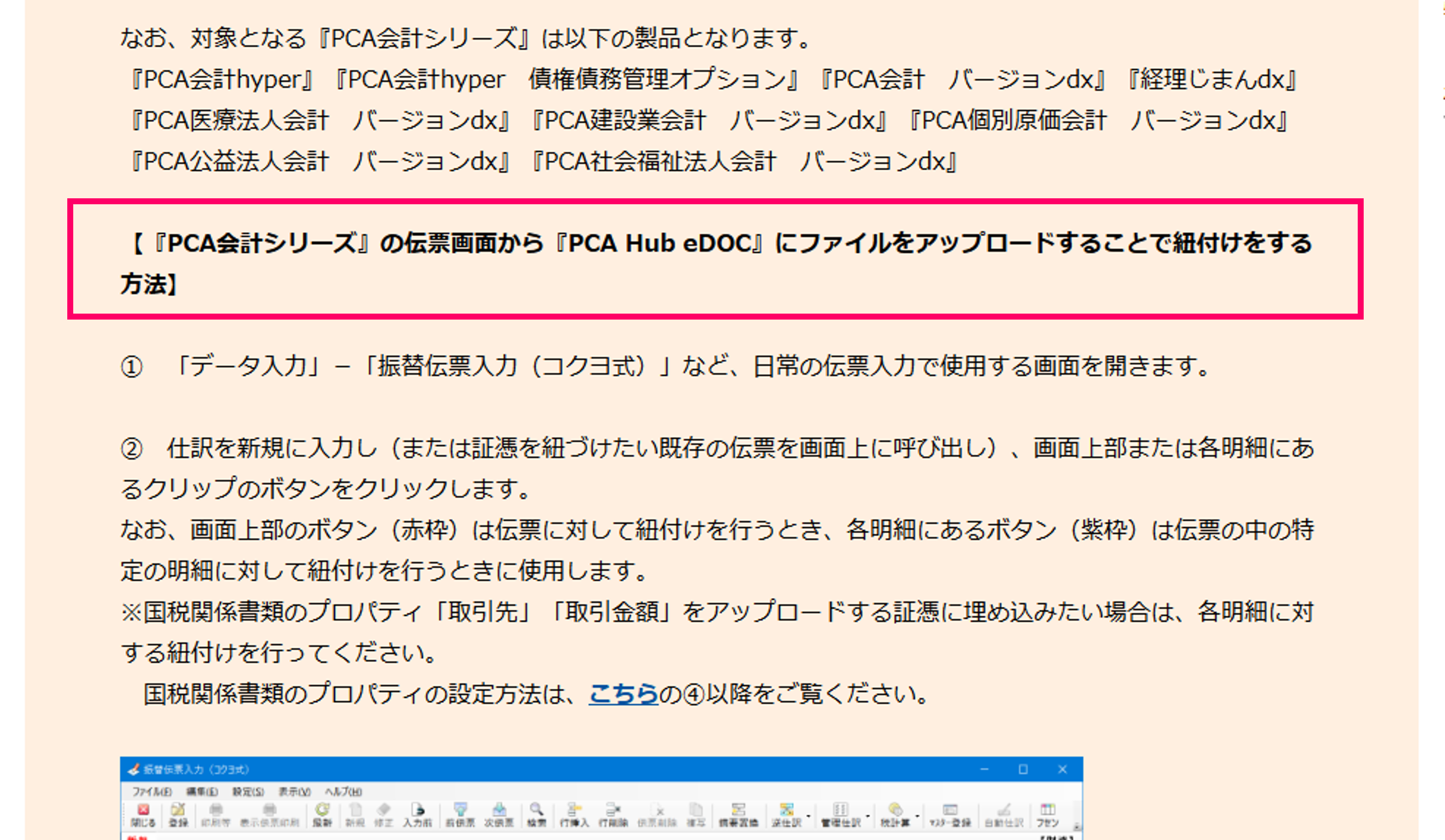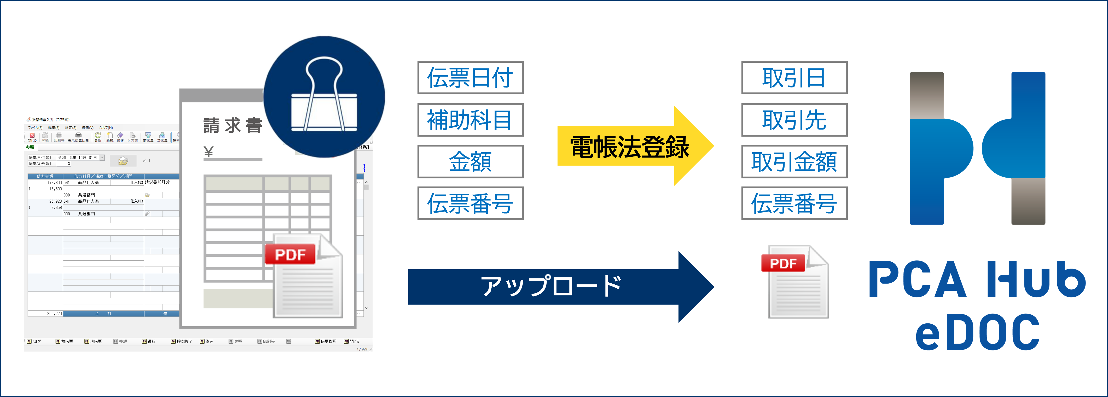 『PCA会計シリーズ』の仕訳入力画面から入力した仕訳に紐づけて、領収書や請求書などの証憑ファイルを『PCA Hub eDOC』に保存(アップロード)します。