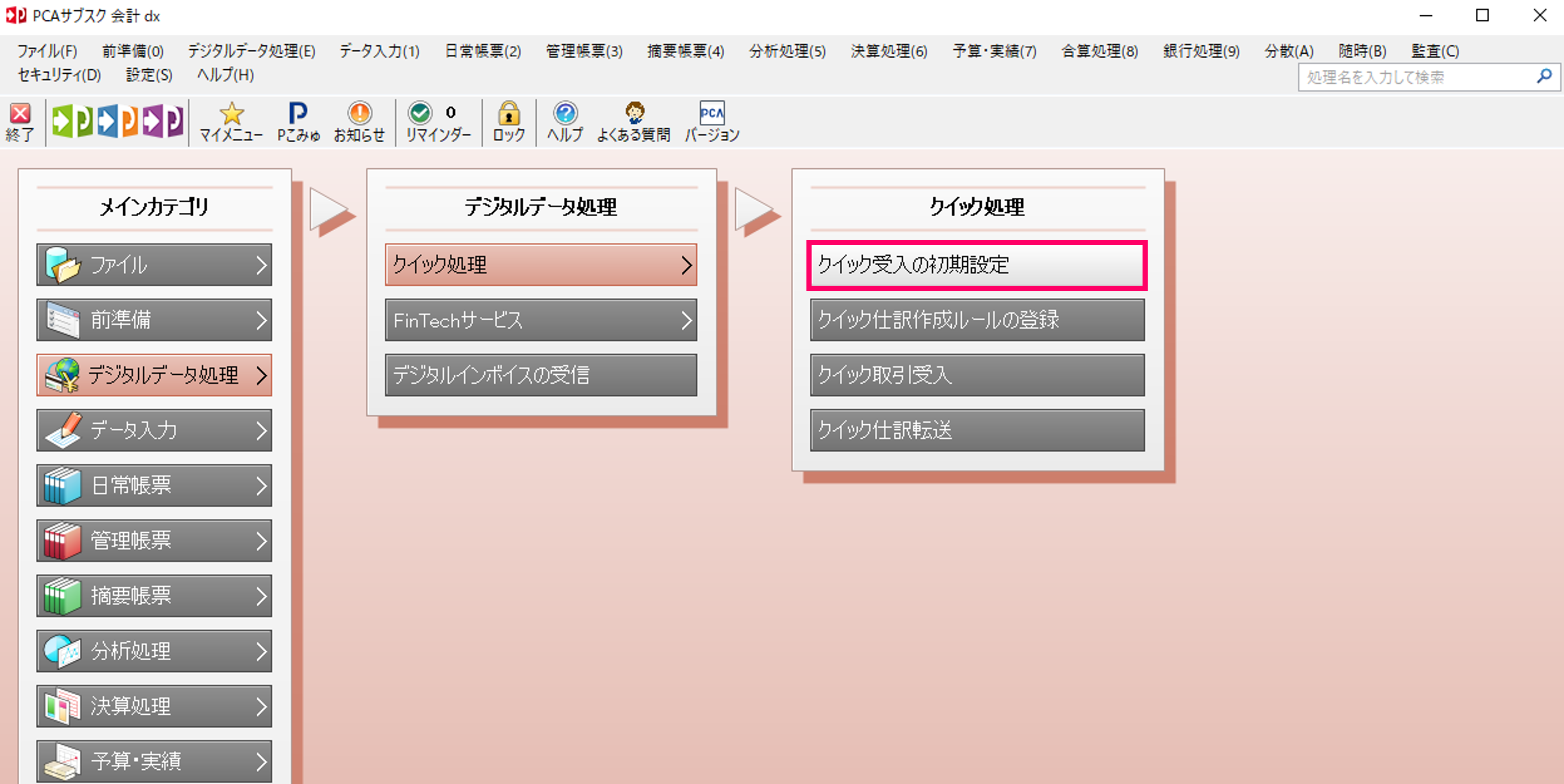 『PCA会計』の「クイック受入の初期設定」を選択します。