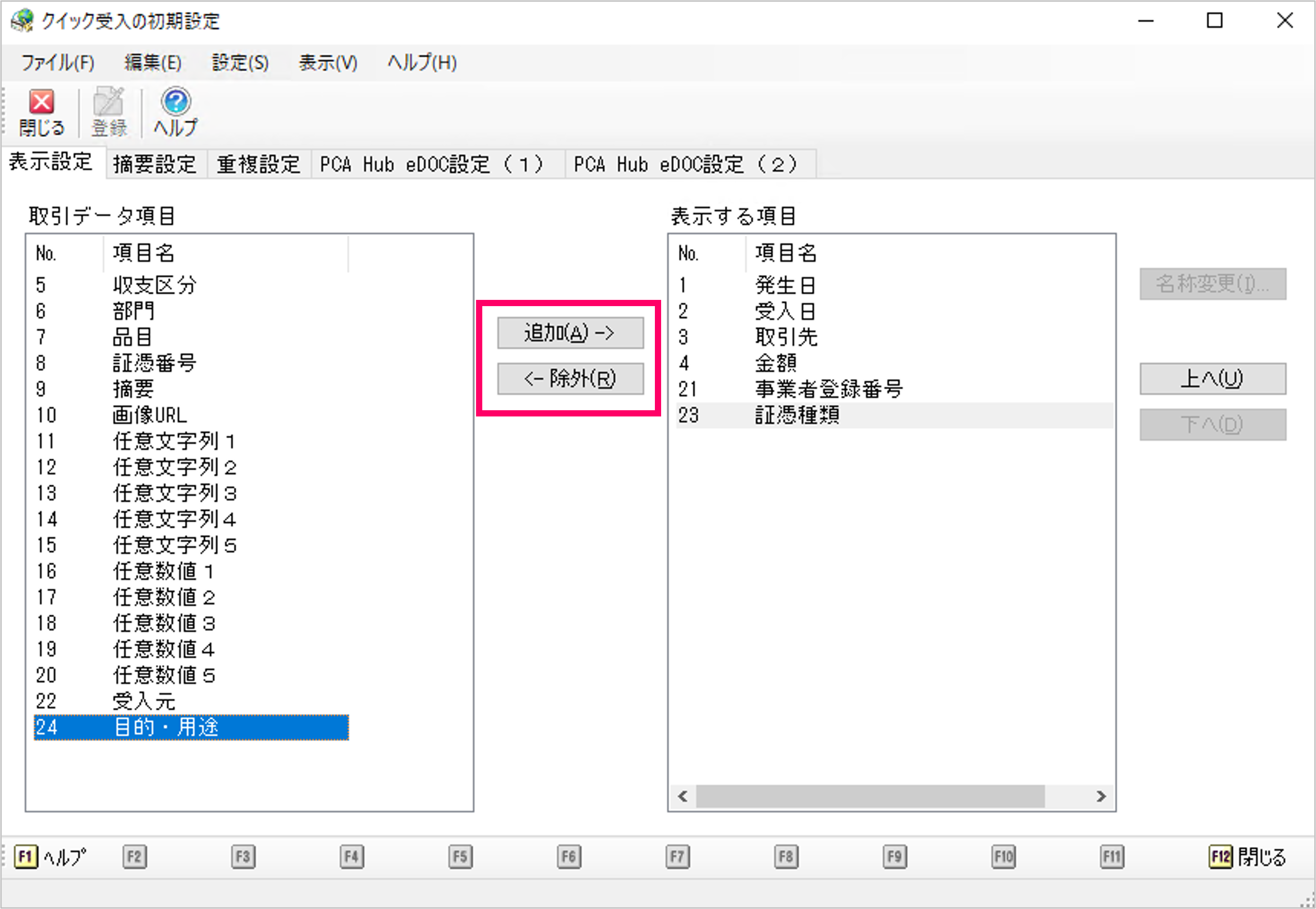 ここで設定した項目は、「クイック取引受入と仕訳転送」の画面に表示されます。
