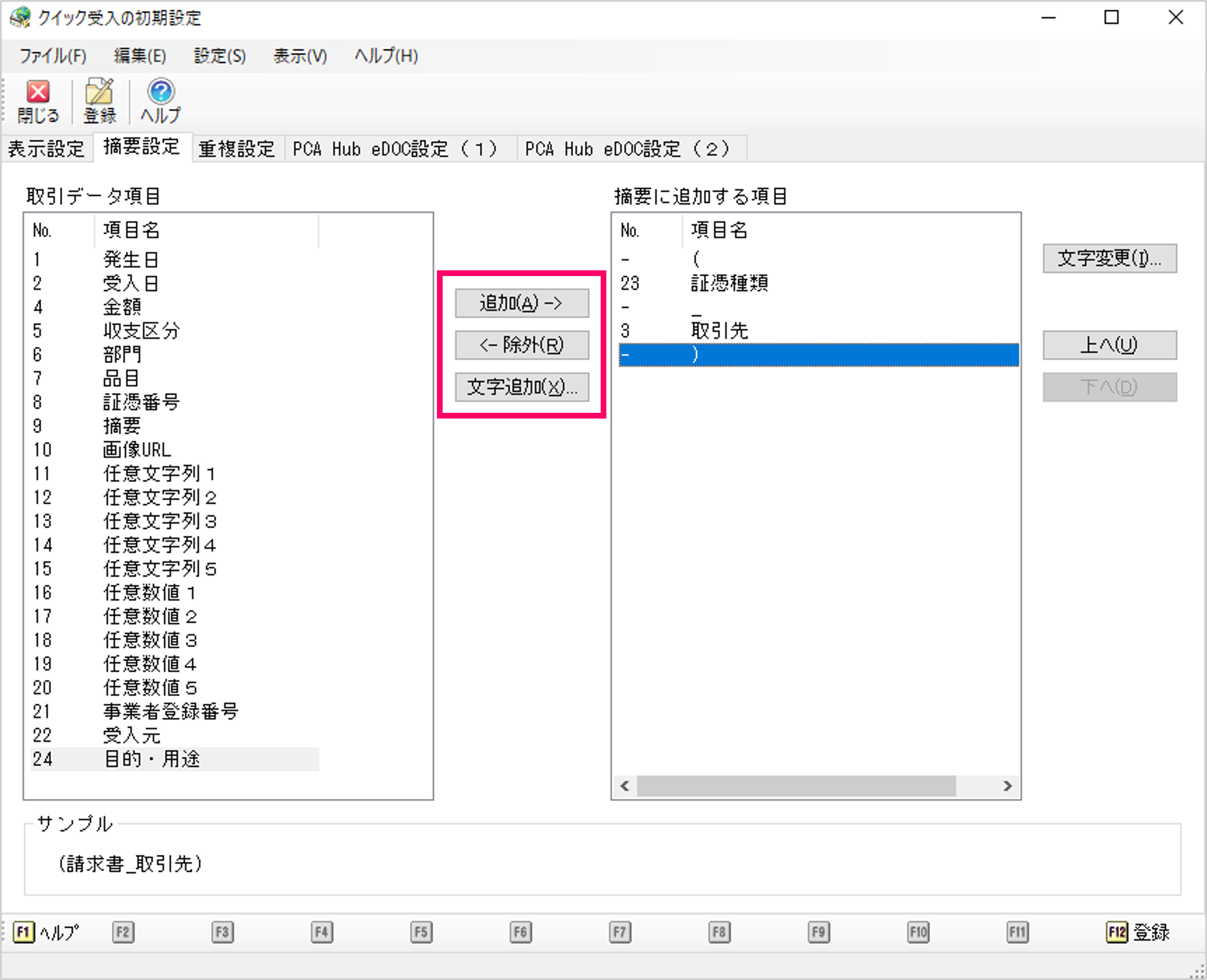 (2) 「摘要設定」を設定します。[取引データ項目]から項目を選択して「追加」をクリック、または[適用に追加する項目]から項目を選択して「除外」をクリックします。設定内容を確認して「登録」をクリックします。