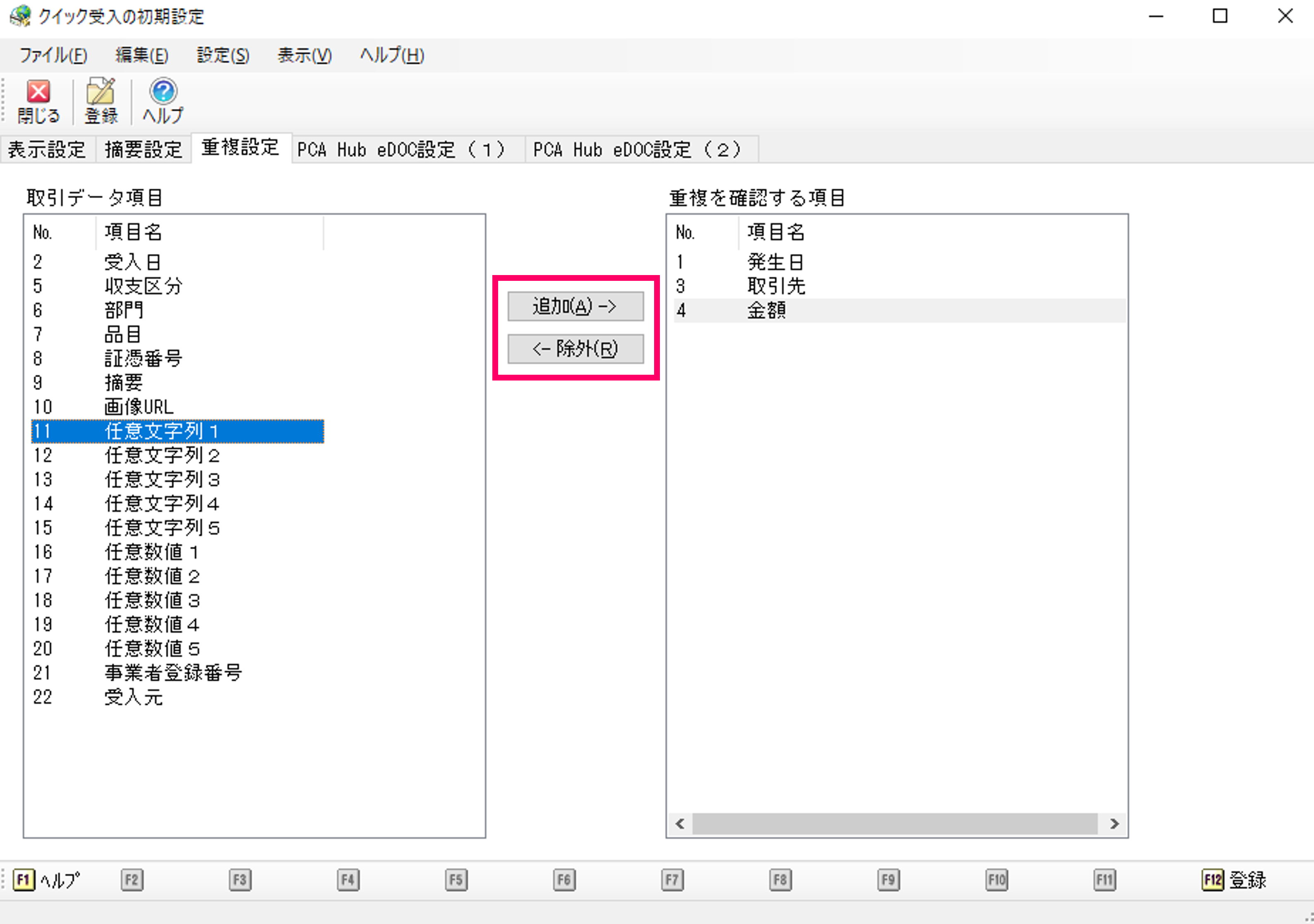 (3) 「重複設定」を設定します。 [取引データ項目]から項目を選択して「追加」をクリック、または[重複を確認する項目]から項目を選択して「除外」をクリックします。設定内容を確認して「登録」をクリックします。