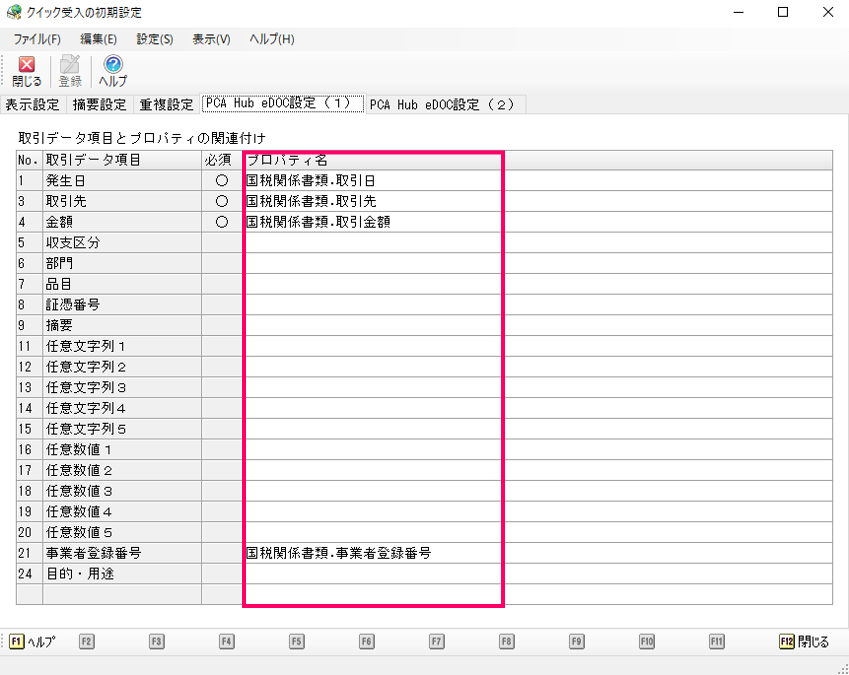(4) 「PCA Hub eDOC設定(1)」を設定します。[取引データ項目]と、『PCA Hub eDOC』にアップロードされた証憑ファイルのプロパティとの関連付けを設定します。設定内容を確認して「登録」をクリックします。