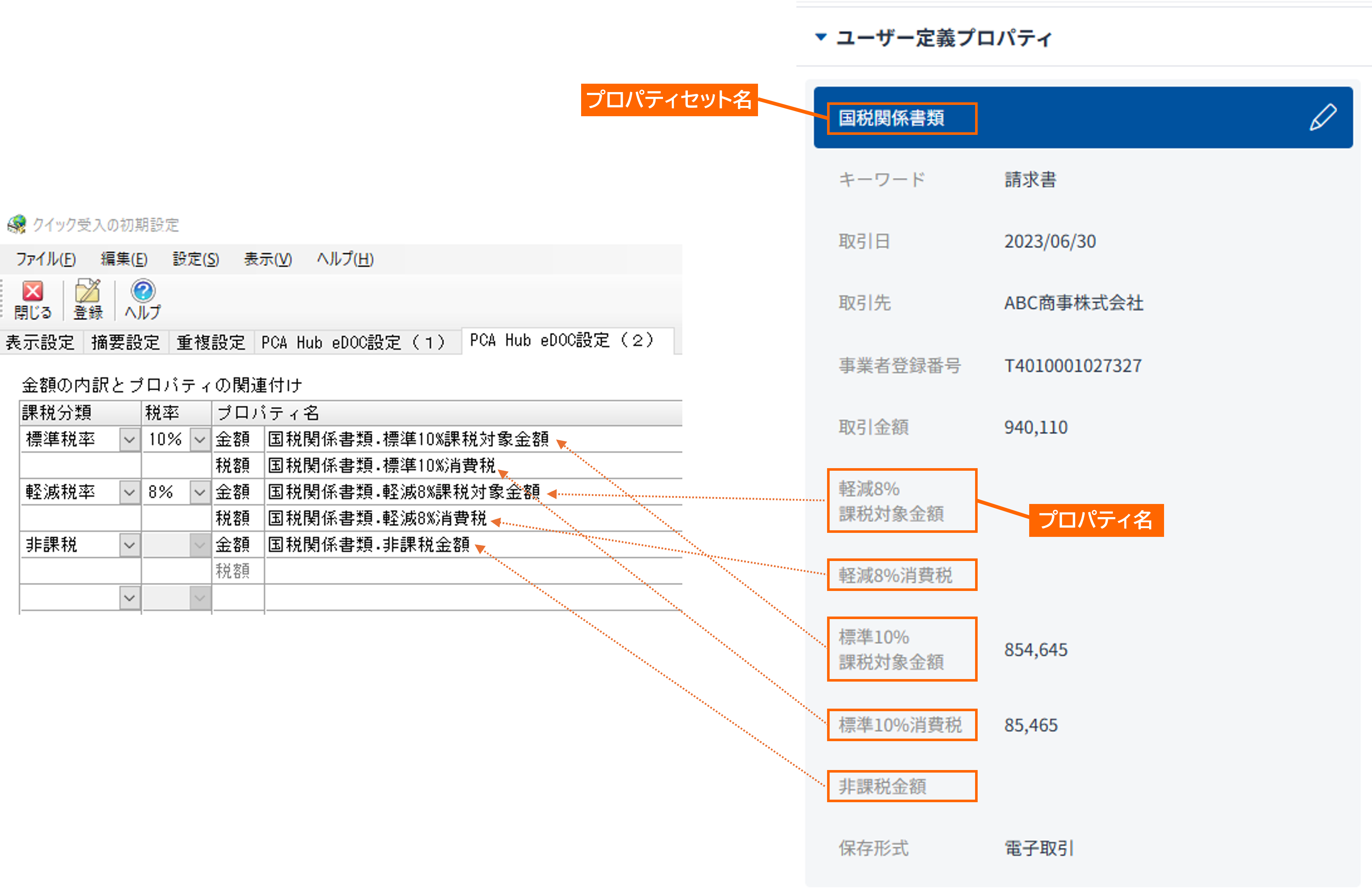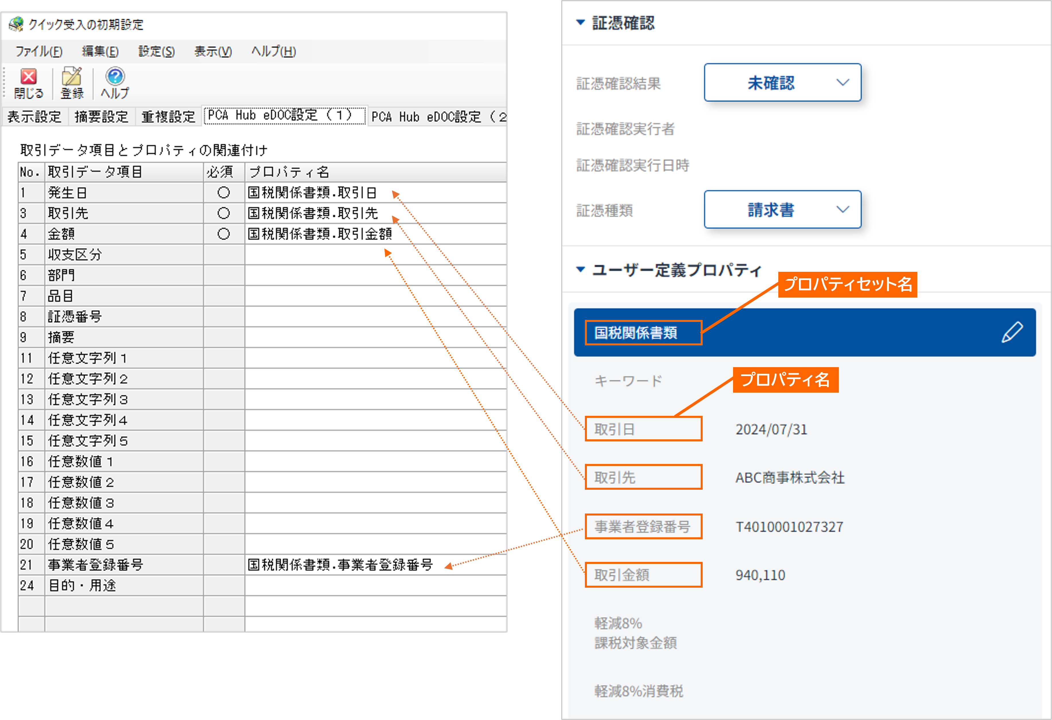 取引データとは、『PCA会計』で『PCA Hub eDOC』のプロパティ情報を受け入れるための項目です。