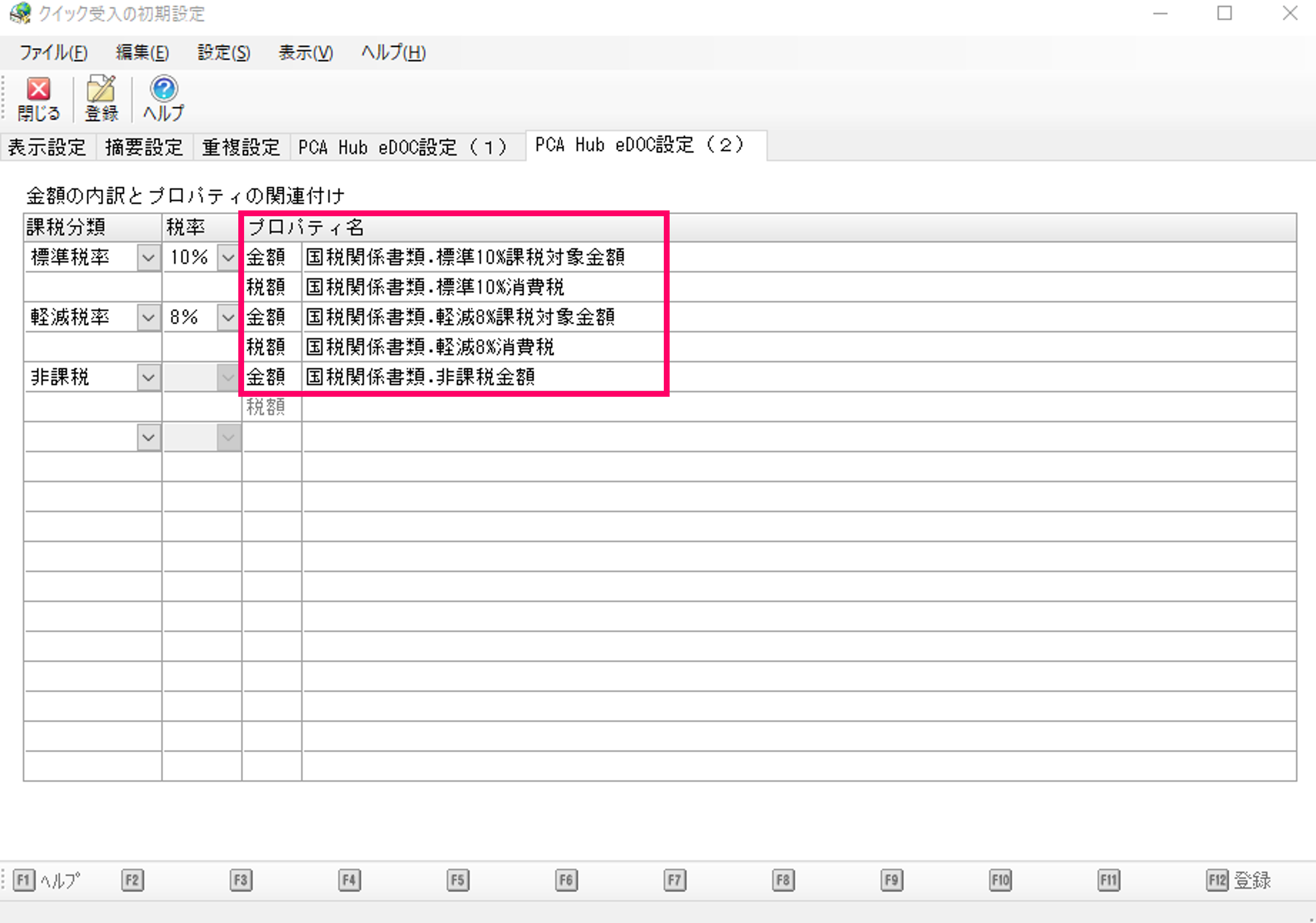 (5) 「PCA Hub eDOC設定(2)」を設定します。仕訳作成時の[金額]の内訳と、『PCA Hub eDOC』にアップロードされた証憑ファイルのプロパティとの関連付けを設定します。設定内容を確認して「登録」をクリックします。