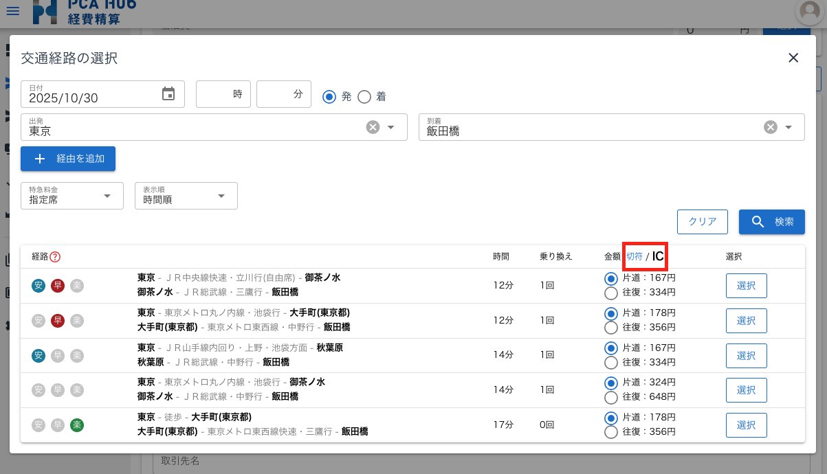 交通経路を検索するとIC料金が表示されますが、通常料金(切符料金)の場合は「切符」を選択してください。
