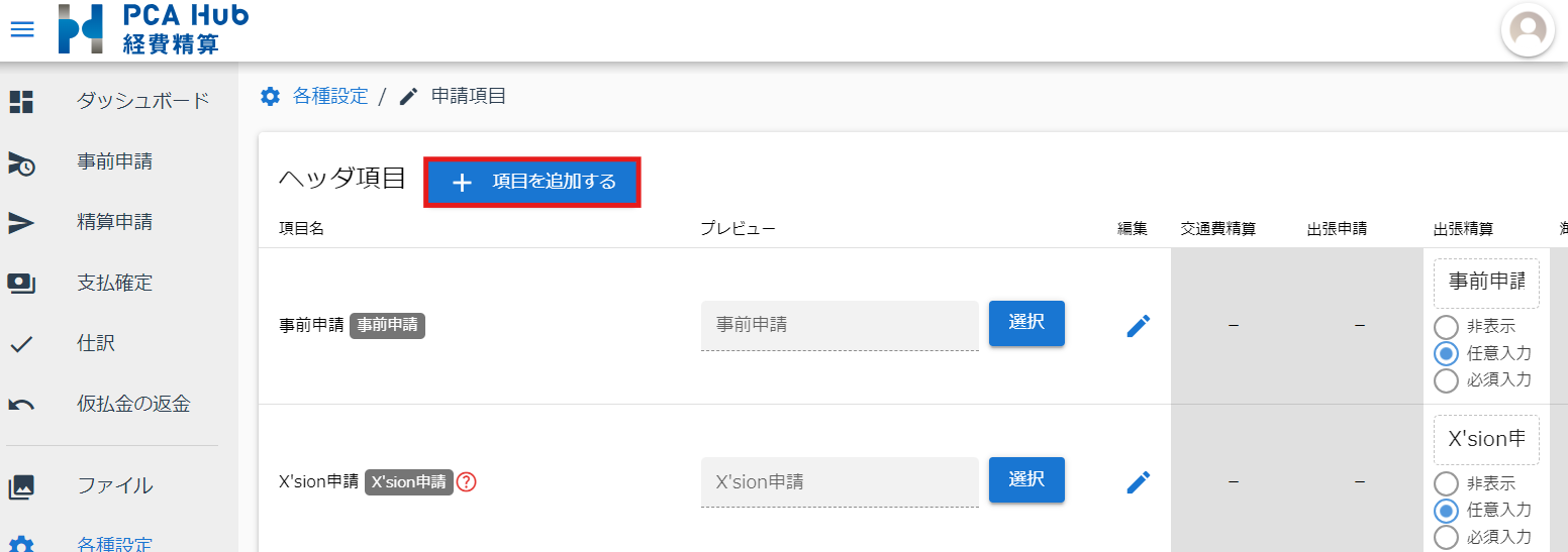 (2) ヘッダ項目もしくは明細項目の「項目を追加する」ボタンを選択します。