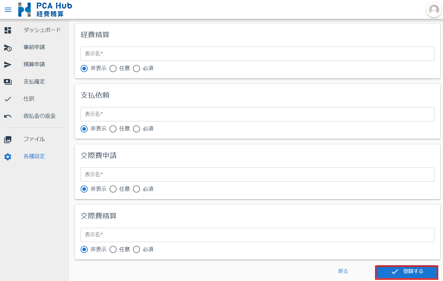 事前申請4つと精算申請6つの申請フォームに対して、申請する項目を設定します。