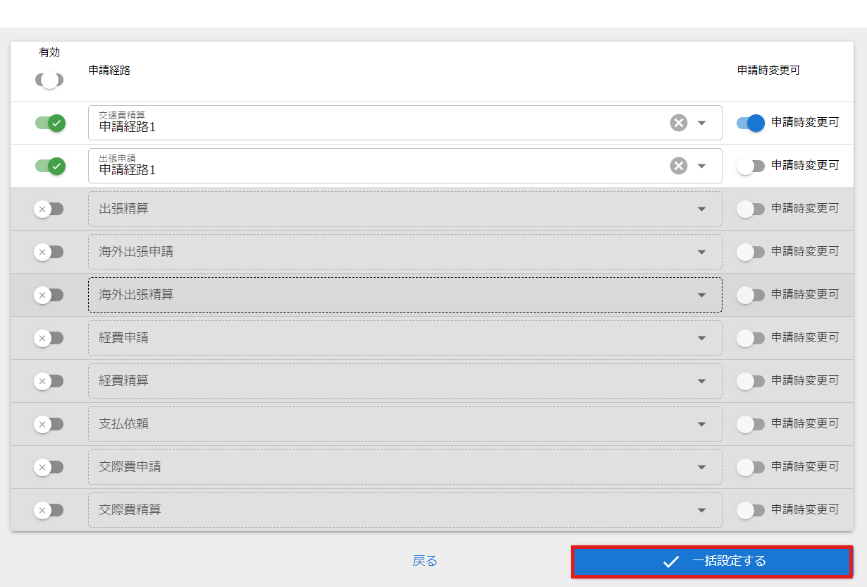 (3) 申請種別ごとに申請経路を選択し、「一括設定する」ボタンを選択します。