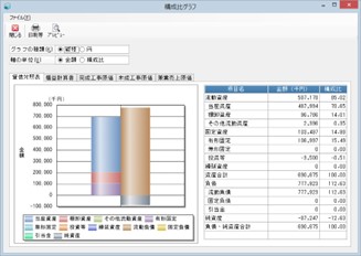 ツールバーの[グラフ]ボタンをクリックすると、貸借対照表、損益計算書、完成工事原価、未成