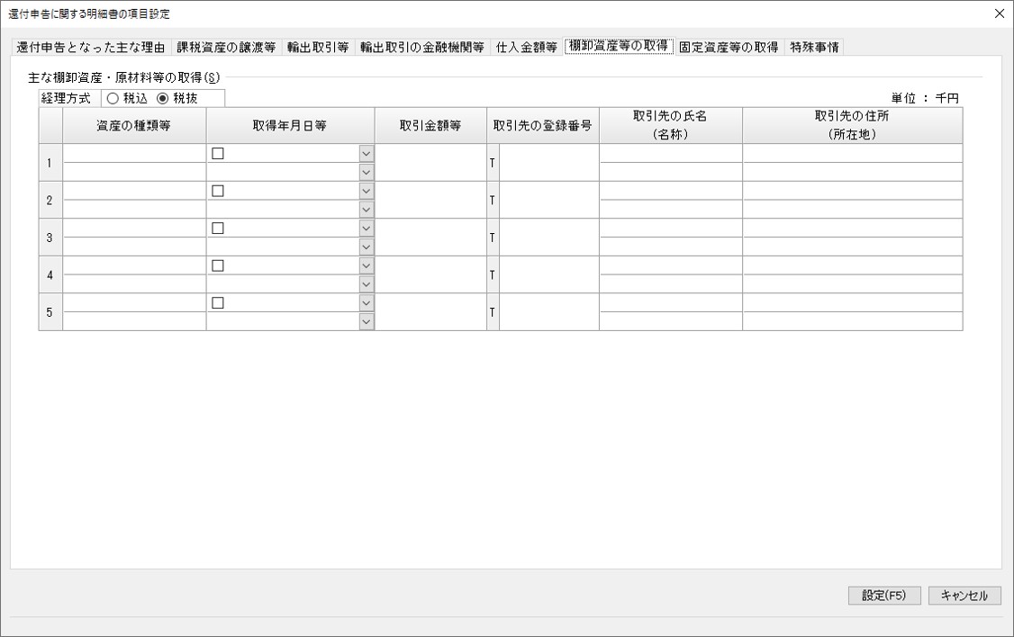「還付申告に関する明細書の項目設定」-「仕入金額等」タブ