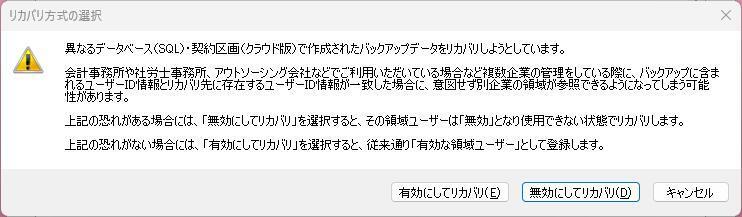 ※ 「有効にしてリカバリ」を選択した場合は、ユーザーIDが重複していても従来通りにリカバリを実行します。