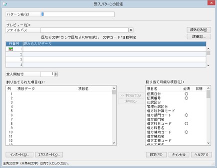 (3) 「受入パターンの設定」画面が表示されますので、[読み込み]ボタンをクリックして、読み込んだデータをプレビューします。[詳細]ボタンをクリックすると、ファイルの区切り文字、文字コードを設定することができます。