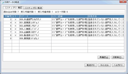 転送に成功したデータを取り除き、先頭項目に行番号とエラー情報を付加したファイルを作成する場合は、[再受入ファイルの作成]ボタンをクリックします。再受入ファイルを修正することで、未転送データのみを抽出した汎用データの作成→受入を実行することができます。