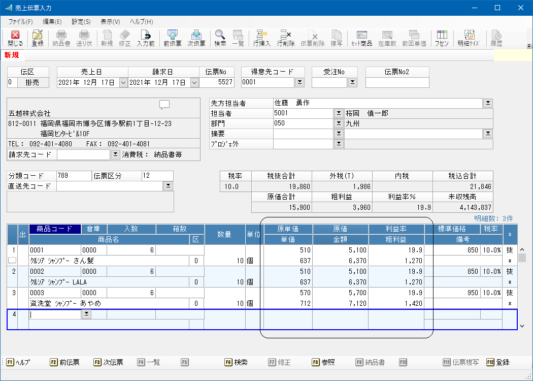 売上単価を求める時に、仮の売上金額÷数量で端数が発生した場合、売上金額などは再計算されます。したがって、入力した粗利益・利益率と計算されたそれが、異なってくる可能性もあります。この場合、計算された数字で再表示しています。