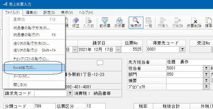 メニューバーの「ファイル」-「Excel出力」をクリックします。