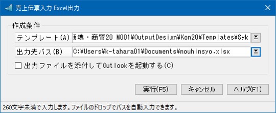 チェックマークを付けると、処理終了後に作成したExcelファイルを添付した状態でOutlookのメッセージ作成画面が開きます。得意先マスターにメールアドレスが登録されていれば「宛先」に代入されます。