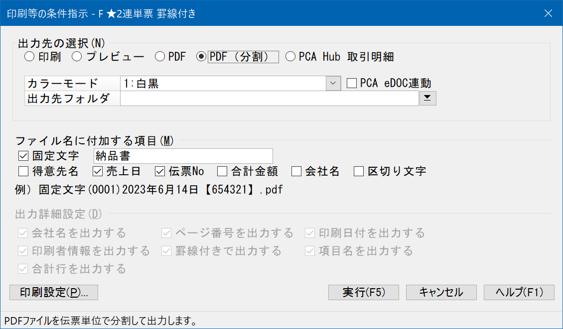 ※[PDF]のときは「出力先パス」でファイル名まで指示しますが、[PDF(分割)]のときは「出力先フォルダ」でフォルダ名までを指示します。