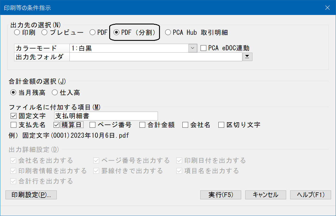 ※[PDF]のときは「出力先パス」でファイル名まで指示しますが、[PDF(分割)]のときは「出力先フォルダ」でフォルダ名までを指示します。