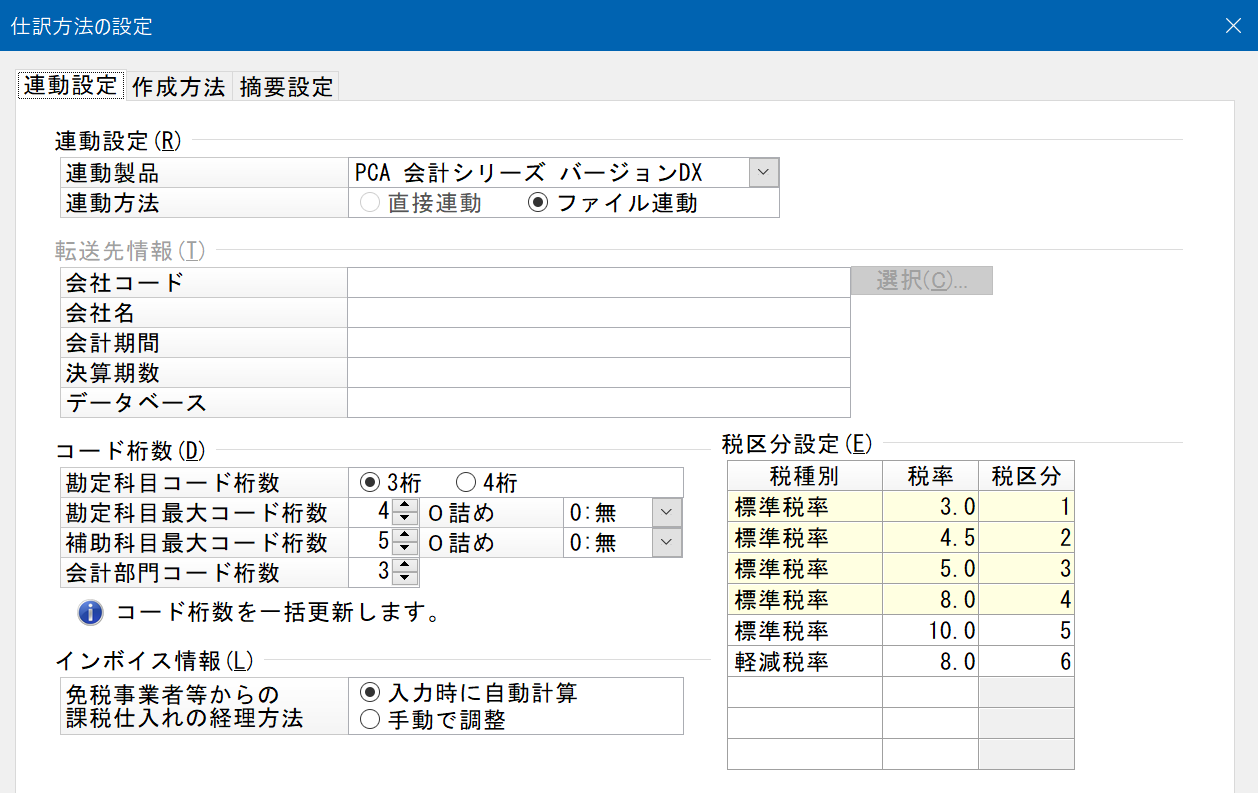 • 直接連動の場合、以降の桁数設定には『PCA会計』の情報がセットされ設定はできません。