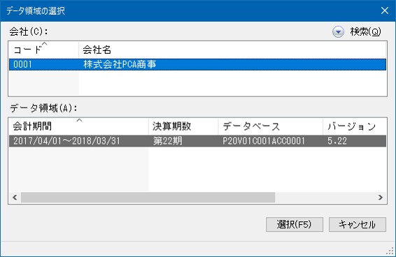 連動製品を『PCA 会計シリーズ バージョンDX』とし、連動方法を「直接連動」とした場合に、『PCA 会計シリーズ バージョンDX』のデータ領域を選択します。