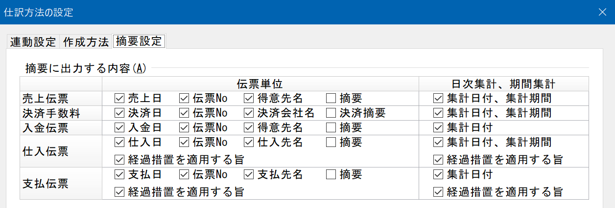 仕訳データの摘要に出力する内容を設定します。伝票ごとに、「伝票単位」と「日次集計、期間集計」の集計方法に対して設定します。「決済手数料」はクレジット売上の、決済手数料仕訳データを対象にします。