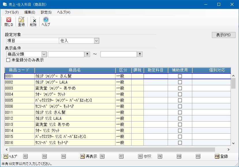 「区分」欄は、商品のマスター区分を見て“一般”“雑商品”“諸雑費”“値引”と表示します。