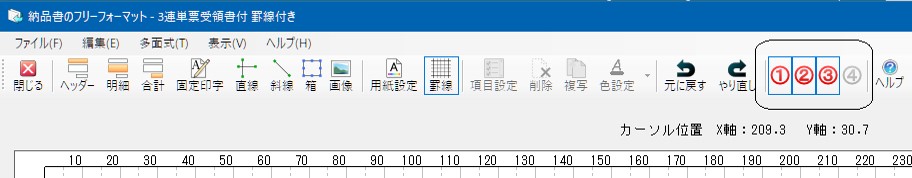 納品書を例にすると、用紙1ページ内に<納品書/納品書(控)/受領書>などと複数の面に分かれて設計されている用紙のことを本ソフトでは、「多面式」と呼んでいます。