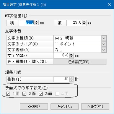 「項目設定」画面の「多面式での印字設定」欄で印字する面を指定できます。