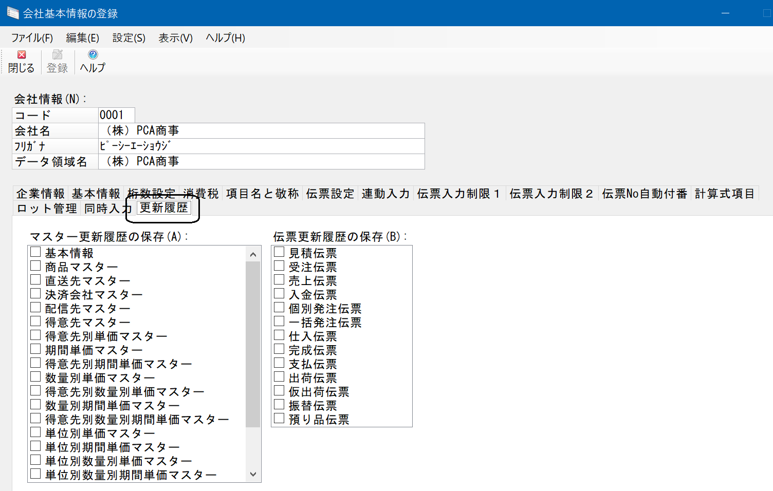 (2) 画面上側には、マスター・伝票の最も新しい履歴の一部項目が表示されます。