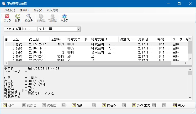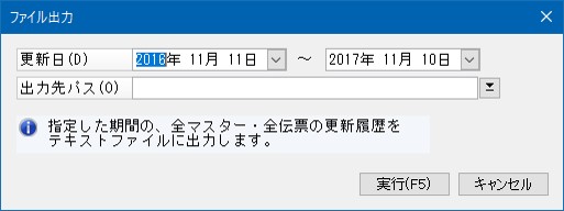 「ファイル」-「ファイル出力」をクリックすることで、履歴情報をテキストファイルとして出力することができます。全マスター・伝票の履歴を同時に出力します。