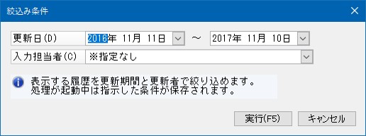 [絞込み]ボタンをクリックすることで表示する履歴を絞り込むことができます。