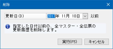 「編集」-「削除」をクリックすることで、履歴情報を削除できます。全マスター・伝票の履歴を削除します。