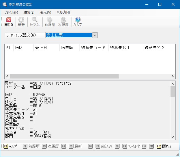※ 「ファイル選択」欄で履歴を表示するマスター・伝票を選択するまでは何も表示されません。