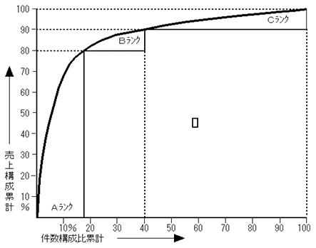 グラフを基に、得意先や商品の件数と売上の関係から説明致しますと、初めは、わずかな件数で多くの売上を確保してますが、次第にカーブがゆるやかに変化し、残り10~20%の売上を確保するために多くの件数が必要になることが、分かります。全件を平等に管理するのは、膨大な販売費がかかるだけでなく、事実上不可能に近いことです。ある程度の売上を保持するために何を優先的に管理すればよいかを明確にすることが、ランクを付ける目的といえます。