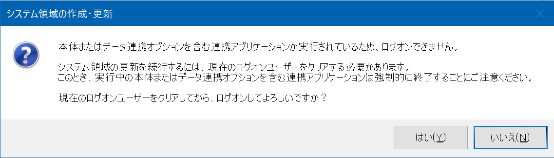 [いいえ]をクリックして実行を中止し、『データ連携オプション』を終了させてから、再度「システム領域の作成・更新」を実行することを推奨します。