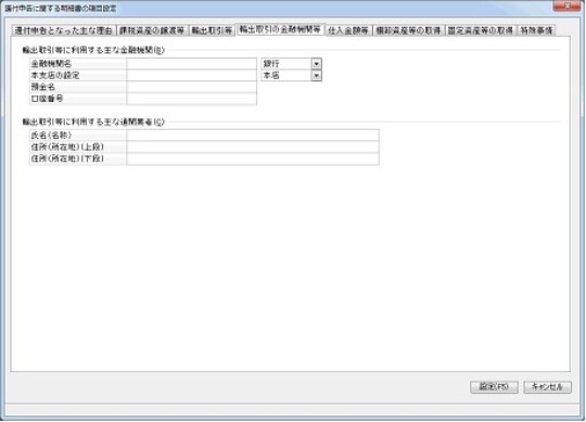「還付申告に関する明細書の項目設定」-「輸出取引の金融機関等」タブ