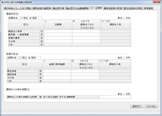「還付申告に関する明細書の項目設定」-「仕入金額等」タブ
