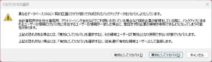 「動作選択メッセージを表示する」を選択した場合、バックアップデータに含まれるシステム領域の識別値と現在のシステム領域の識別値が異なる場合に以下のようなメッセージが表示されます。