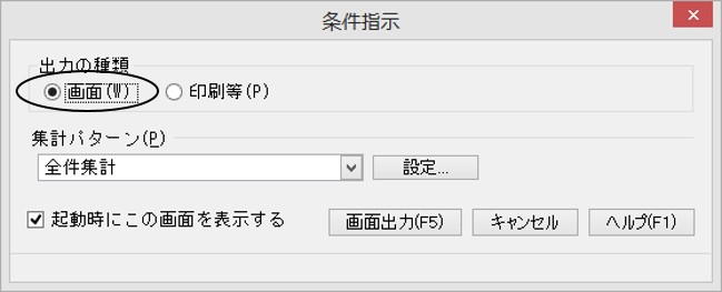 ※ 「条件指示」画面の「起動時にこの画面を表示する」にチェックマークを付けると、処理の起動時に「条件指示」画面が表示されるようになります。