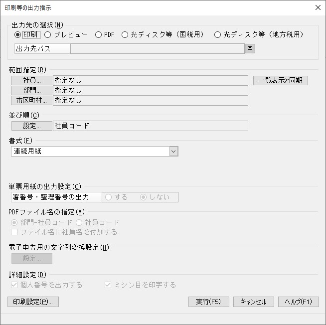 条件指示後、「出力先の選択」で“印刷”“プレビュー”等を選択し、[実行]ボタンをクリックします。