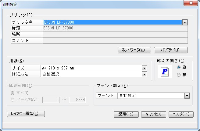 ボタンをクリックして、印刷を実行するプリンタを選択します。 [ネットワーク]ボタンをクリックすると、ネットワーク上のプリンタを選択することができます。 [プロパティ]ボタンをクリックすると、プリンタドライバの設定画面が表示されます。 |
